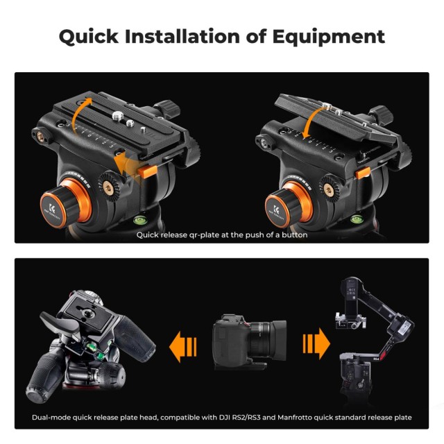 - Fluidna glava profesionalnega razreda omogoča gladko premikanje fotoaparata, primerno za videoposnetke in fino kompozicijo, saj zagotavlja stabilnost fotografiranja. Panoramsko snemanje je opremljeno z brezstopenjsko nastavljivim blaženjem, s katerim lahko enostavno prilagodite občutek blaženja in dosežete 360-stopinjsko vodoravno vrtenje, kar zagotavlja natančen nadzor in hitro prilagajanje za izpolnjevanje več potreb pri snemanju.