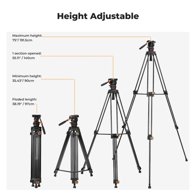 10KG nosilnost Fluid Head Tripod Tripod kamere Največja višina 75,2 "/ 1,91 m Video stativ VA3 + BV20. Fluidna glava profesionalnega razreda zagotavlja gladko premikanje fotoaparata, primerna za videoposnetke in fino kompozicijo, saj zagotavlja stabilnost fotografiranja. Panoramsko snemanje je opremljeno z neskončno nastavljivim blaženjem, s katerim lahko enostavno prilagodite občutek blaženja in dosežete 360-stopinjsko vodoravno vrtenje, kar zagotavlja natančen nadzor in hitro prilagajanje za izpolnjevanje več potreb pri snemanju.
