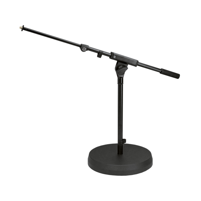 Nizkoprofilno stojalo za mikrofon z okroglim podstavkom in teleskopsko roko, zasnovano za bas bobne in akustične instrumente. Vzdržljiva okrogla podlaga iz litega železa z gumijastim vložkom proti vibracijam za filtriranje hrupa.