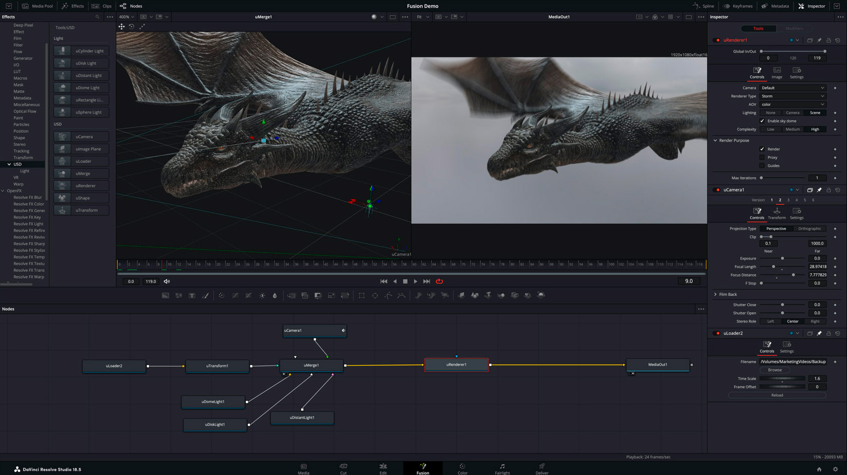 Razdelek FusionOrodje za kompozicijo Fusion od različice 18.5 podpira datoteke Universal Scene Descriptor za lažje sodelovanje z delovnimi postajami za učinke. Tako lahko uvozite 3D geometrijo, osvetlitev, materiale ali animacije ter nato spreminjate in upodabljate prizore (z upodabljavci na osnovi Hydre, kot je Storm). Novo orodje Multi-merge omogoča enostavno združevanje različnih medijev v večplastne kompozicije; enako uporabno je orodje Map Depth (v različici Studio), ki uporablja tehnologijo AI.