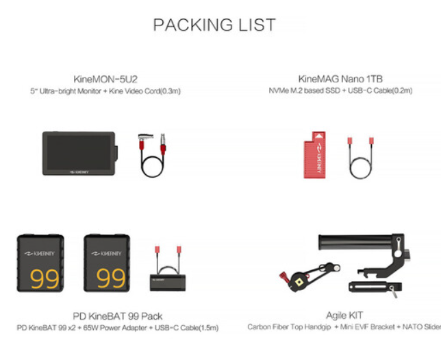 Paket Kinefinity MAVO mark2 Agile Pack (A901-004-01) vsebuje KineMON 5U II 2000-nit zaslon na dotik, 1 TB KineMAG Nano SSD, 2x PD KineBAT 99 (95 Wh V-mount z USB-C PD), dvojni polnilnik in ogljikov ročaj – najboljša oprema za lastnike MAVO mark2 LF/S35.