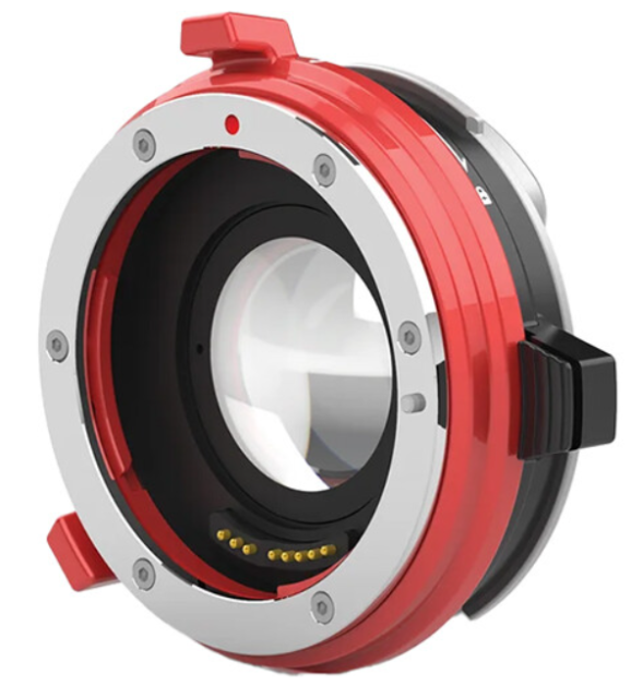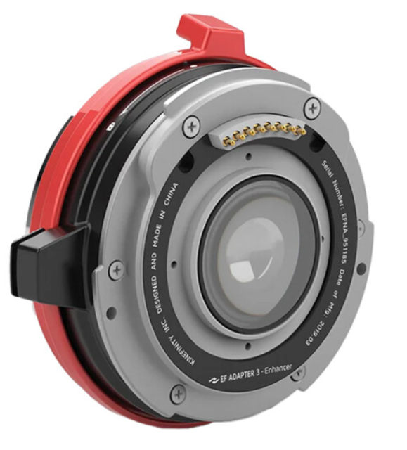 Kinefinity A230-002-01 EF 3 montažni adapter z KineEnhancer je 200 g aktiven adapter EF-KineMOUNT, ki vključuje 0,72× optični reduktor goriščne razdalje, poveča zaslonko za +1 stopnjo, razširi vidno polje in pretvori polnoformatno EF steklo v pokritost S35 s popolnim elektronskim nadzorom zaslonke/AF/IS in zamenjavo brez orodja.
