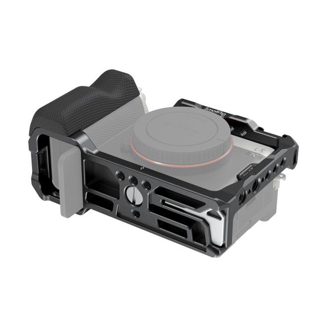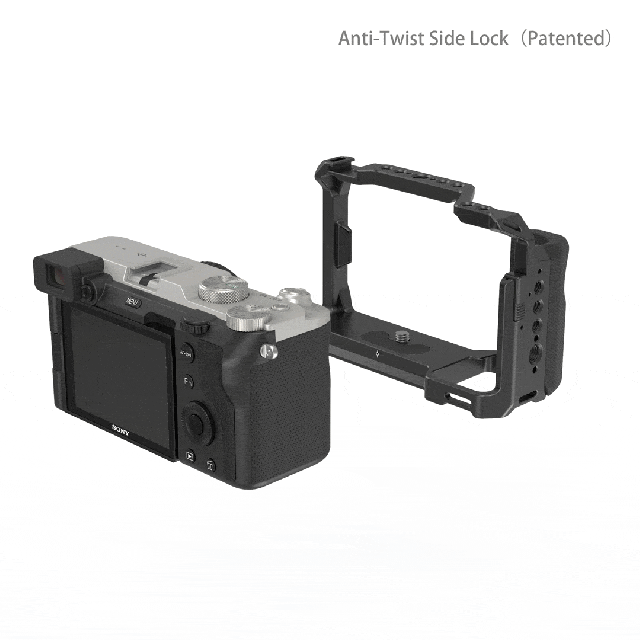 Kletka SmallRig s stranskim ročajem za fotoaparat Sony A7C 3212 je zasnovana tako, da zagotavlja točke za pritrditev dodatne opreme, kot so monitorji, mikrofoni in luči LED, med profesionalnim snemanjem videoposnetkov. Ima vgrajen silikonski ročaj, ki je ergonomsko oblikovan in izboljša izkušnjo pri držanju. Kletka fotoaparat pritrdi z vijakom 1/4"-20 na dnu. Za dodatno preprečevanje zvijanja lahko uporabite tudi zaklep na desni strani, tako da potisnete drsnik navzgor in pritrdite priloženi majhen vijak v luknjo za trak fotoaparata.