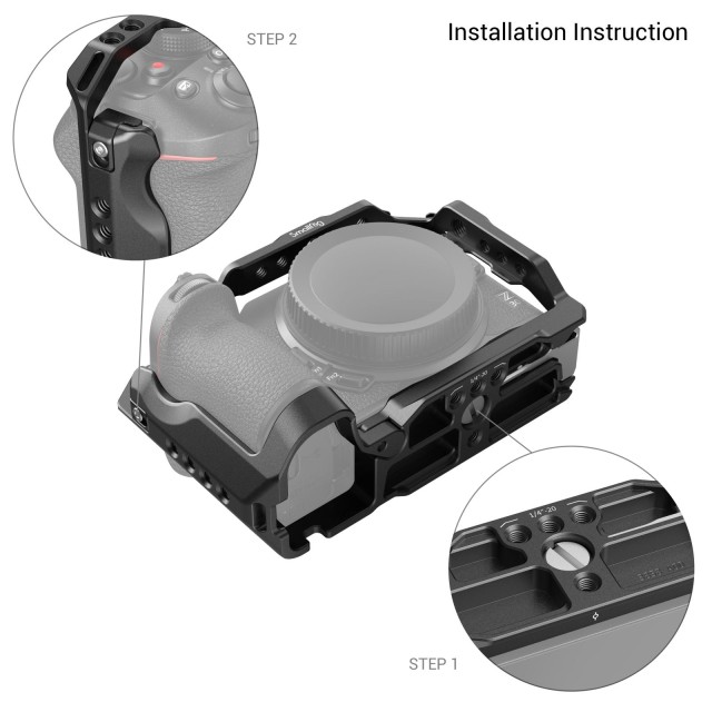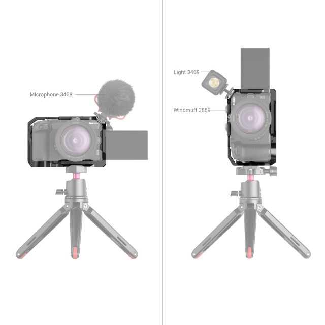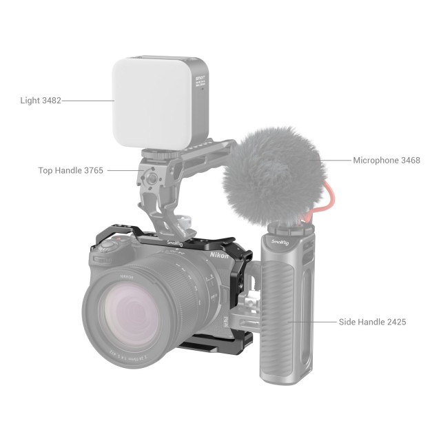 Kletka SmallRig za Nikon Z 30 3858 je zasnovana za zaščito in zavarovanje dodatne opreme. Kletka se pritrdi z vijakom 1/4"-20 in adapterjem s stransko ključavnico na desni strani ter ima silikonske blazinice, ki preprečujejo praske in omogočajo popoln dostop do vseh gumbov, vmesnikov, preklopnega zaslona itd. Na vratih za baterijo ima tudi ročico na tečajih, ki se prilagaja ukrivljenosti fotoaparata za udoben oprijem in lažjo zamenjavo baterije; luknje z navojem 1/4"-20 in ARRI 3/8"-16 za namestitev zgornjega ročaja HTS2756, 3765, stranskega ročaja HSS2425, 3814, objemke za kabel HDMI 1822; na vrhu pa je nastavek za hladno čeveljčico za mikrofon in LED-luč za snemanje vlogov. Ploščica za hitro sproščanje Arca-Swiss na dnu podpira stativ Arca-Swiss in stabilizator DJI RS 2 / RSC 2 / RS 3 / RS 3 Pro za hitro preklapljanje med načini stativa, stabilizatorja in ročnega fotoaparata. Poleg tega je za vaše udobje na dnu magnetni dvostranski ključ za montažo in demontažo.