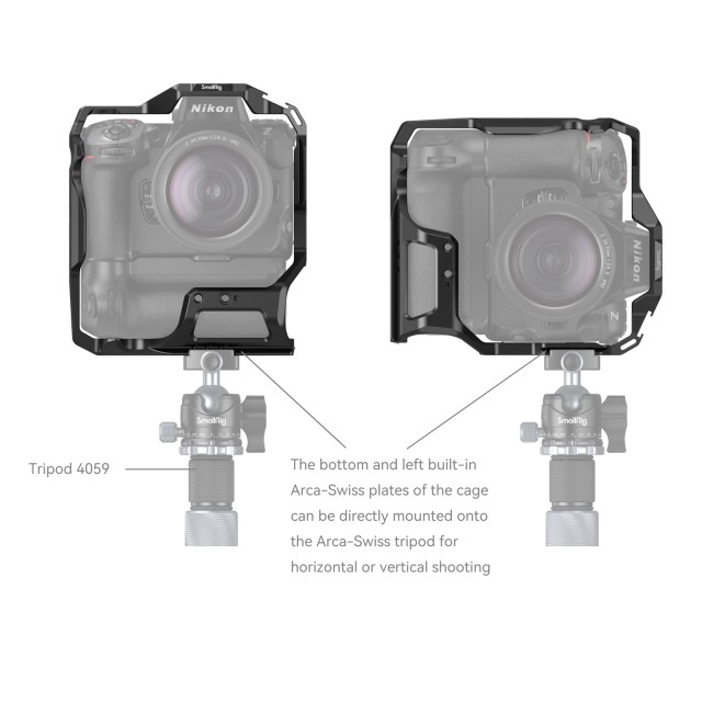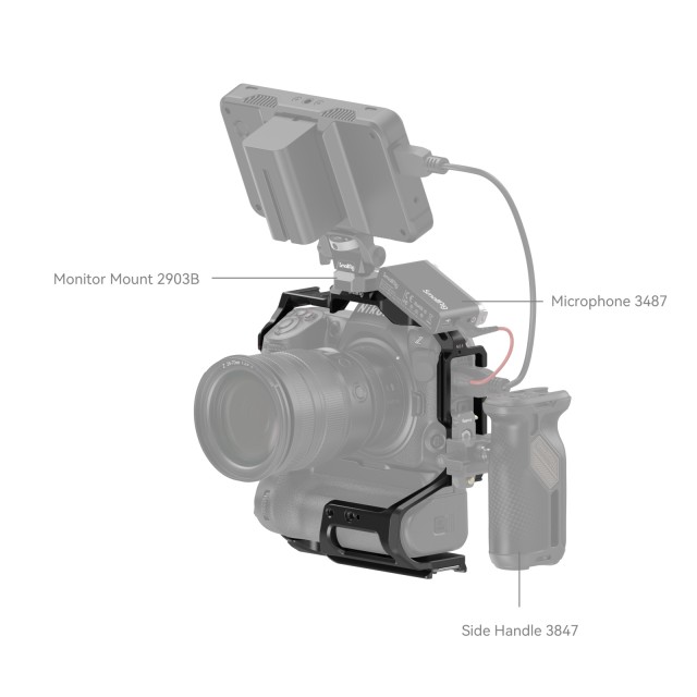 Kletka SmallRig za Nikon Z 8 z baterijskim držalom MB-N12 3982 je zasnovana za zaščito fotoaparata in dodatne opreme. Fotoaparat pritrdi z enim spodnjim vijakom 1/4"-20 in enim vijakom M2,5 na vsaki strani, z gumijastimi blazinicami za preprečevanje prask ter omogoča popoln dostop do gumbov, rež za kartice, predala za baterijo in odklopnega zaslona. Točke za pritrditev dodatne opreme vključujejo luknje z navojem 1/4"-20 in 3/8"-16 ter luknjo za pozicioniranje ARRI 3/8"-16, ki podpirajo zgornji ročaj 2165 in 1638, stranski ročaj 2093 in 2425, nosilca za monitor 2903 in 2904 ter magično roko 3875; dva nosilca Cold Shoe ustrezata mikrofonu in video luči LED; spodnja plošča s hitrim sproščanjem in stranska plošča Arca Swiss pa omogočata vodoravno in navpično snemanje na stativih. Spodnja plošča Arca-Swiss s hitrim sproščanjem podpira tudi gimbale DJI RS 2 / RSC 2 / RS 3 / RS 3 Pro za hitro preklapljanje med ročnim snemanjem, gimbalom in načinom za stativ. Na sprednji strani sta dve luknji z navojem 1/4"-20 za dvojno 15-milimetrsko objemko za palico 942, mat škatlo, podporo za objektiv; in ena luknja 1/4"-20 za pozicioniranje za enojno objemko za palico 3276 za sledilnik ostrenja. Poleg tega je priložen magnetni dvostranski ključ za enostavno odstranitev in namestitev.