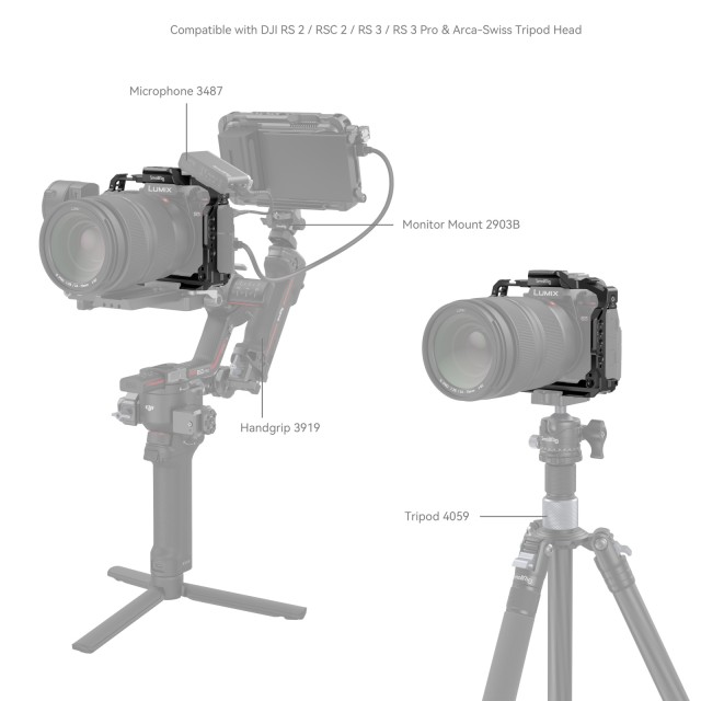 Kletka SmallRig za Panasonic LUMIX S5 II / S5 IIX 4022 je zasnovana za namestitev dodatne opreme in zaščito fotoaparata. Fotoaparat pritrdi z enim spodnjim vijakom 1/4"-20 in dvema stranskima zaklepnima nastavkoma, gumijaste blazinice pa preprečujejo praske. Točke za pritrditev dodatne opreme vključujejo luknje za namestitev 1/4"-20 in ARRI 3/8"-16, ki podpirajo zgornji ročaj 2165C, stranski ročaj 2093 itd. za lažje premikanje fotoaparata in večjo stabilnost; sprednja luknja za namestitev 1/4"-20 ustreza objemki palice 3276 za sistem sledenja ostrenju; zgornja luknja za namestitev ARRI 3/8"-16 pa ustreza nosilcu za monitor 2903B.