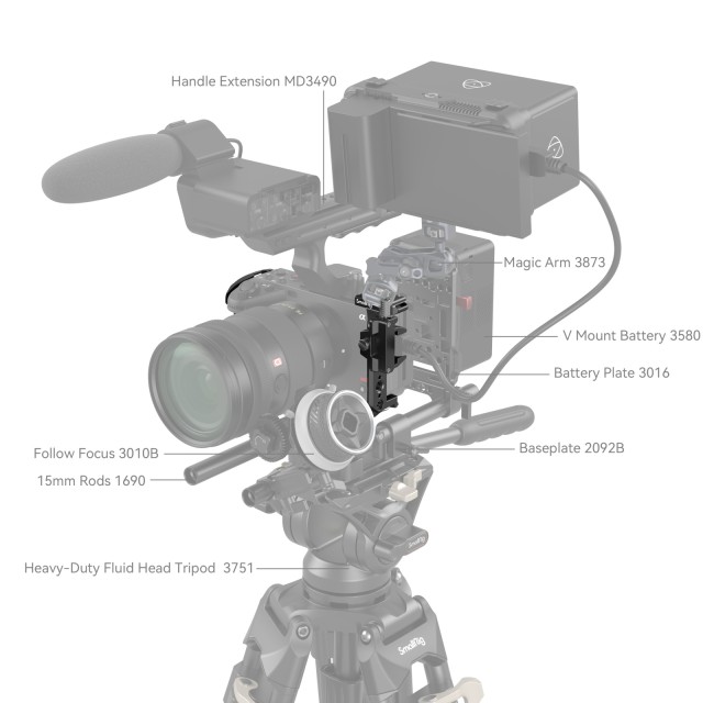 Posebna sponka za kabel HDMI ščiti vmesnik in zagotavlja stabilen prenos signala. Med različnimi nastavki za dodatno opremo so luknje 1/4"-20 za čarobno roko 2070; luknje ARRI za pozicioniranje 3/8"-16 za pritrditev zgornjega držala 2165C ali držala za monitor 2903B; zgornja palica NATO podpira zgornje držalo 3322 in levo stransko držalo 2187B; luknje za pozicioniranje 1/4"-20 v levi zgornji četrtini in na levi strani povezujejo objemko palice 3598 za sledenje ostrenju; dve luknji 1/4"-20 na desni strani omogočata varno pritrditev na ploščo za hitro sproščanje za navpično snemanje; nosilec hladne čevlje podpira mikrofon, luč LED; vrata QD na dnu pa so primerna za trak QD. Ploščico za hitro sproščanje Arca-Swiss na dnu lahko neposredno pritrdite na DJI RS 2 / RSC 2 / RS 3 / RS 3 Pro ali na ploščico za hitro sproščanje (višinsko ploščico) za kardanski vzvod DJI RS 2 / RSC 2 in ploščico za hitro sproščanje Arca-Type 3154. Na obeh straneh in na dnu so luknje za ročni pas 3848 in ramenski pas PSC2428. Priložen je tudi magnetni ključ za enostavno montažo in demontažo.