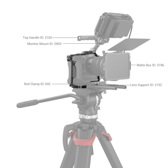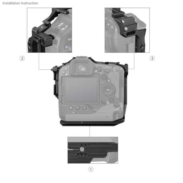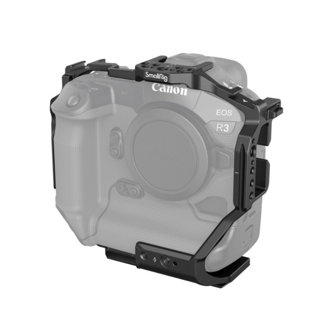 Kletka SmallRig za fotoaparat Canon EOS R3 3884 je zasnovana tako, da zagotavlja zaščito in več pritrdilnih točk. Fotoaparat pritrdi z enim vijakom 1/4''-20 na dnu in dvema stranskima zaklepnima adapterjema na obeh straneh; kletka je opremljena s silikonskimi blazinicami, ki preprečujejo praske in ohranjajo dostop do gumbov, rež za kartice, prostora za baterijo in prevrljivega zaslona. Priložene so luknje z navojem 1/4"-20 in 3/8"16 za zgornji ročaj 2165, 1638, stranski ročaj 2093, 2425, držalo za monitor 2903, 2904, čarobno roko 2115; dve držali za mikrofon, lučka LED; spodnjo in levo ploščo za hitri sprožilec Arca-Swiss lahko enostavno namestite na stativ za vodoravno in navpično snemanje; spodnjo ploščo za hitri sprožilec Arca-Swiss lahko neposredno namestite na stabilizatorje DJI RS 2/RSC 2 za hitro snemanje iz roke, stativa in stabilizatorja. Dve sprednji luknji z navojem 1/4''-20 omogočata pritrditev dvojne 15-milimetrske palične objemke 942 za dodatno opremo, kot sta mat škatla in nastavek za objektiv, sprednja luknja z navojem 1/4''-20 za pozicioniranje pa podpira enojno palično objemko 3276 12/15 mm za rešitve po ostrenju. Poleg tega je priložen izvijač s plosko glavo za enostavno montažo in demontažo.