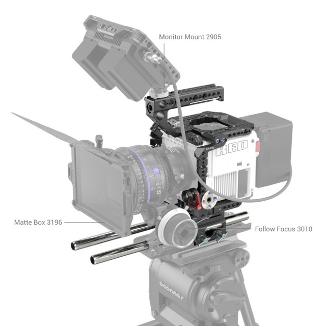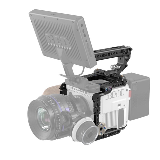 Komplet SmallRig Cage Kit za RED V-RAPTOR 3696 je zasnovan za namestitev dodatne opreme in zaščito kamere. Zaradi modularne zasnove zgornja ali spodnja plošča delujeta neodvisno in zagotavljata lahkotno rešitev za snemanje videoposnetkov. Njeno zgornjo tirnico NATO je mogoče odstraniti in tako omogočiti namestitev originalnega 7-palčnega monitorja LCD DSMC3™ RED® Touch. Komplet je opremljen z dodatnimi nastavki, kot so luknje z navojem 1/4"-20, luknje z navojem 3/8"-16, luknje za pozicioniranje ARRI 3/8"-16, tirnice NATO, nastavki za hladno čeveljc, rozete ARRI, 15 mm objemke za pritrditev monitorja2905, stransko držalo z rozetami ARRI1941 / 1891 itd. za profesionalno video produkcijo. Zgornji nosilec NATO s 15-milimetrsko palično objemko podpira izvirni monitor.