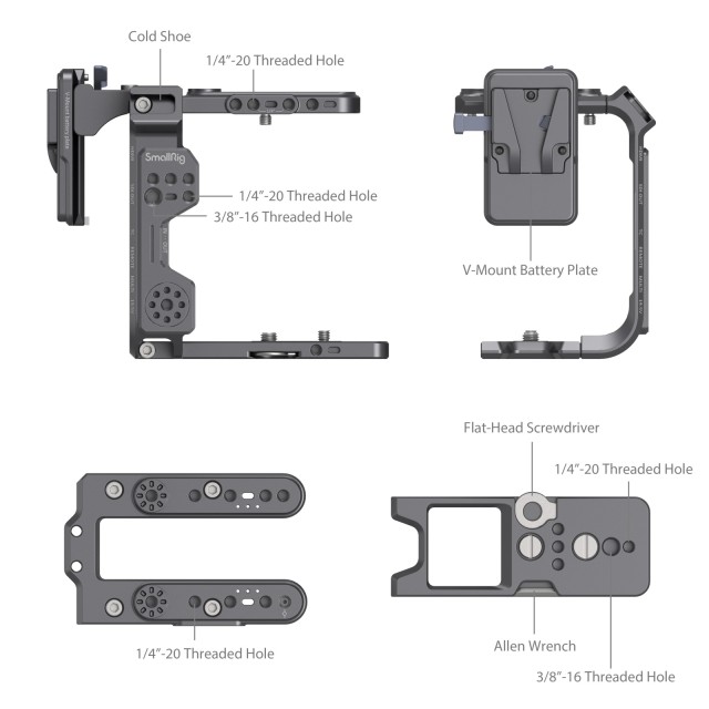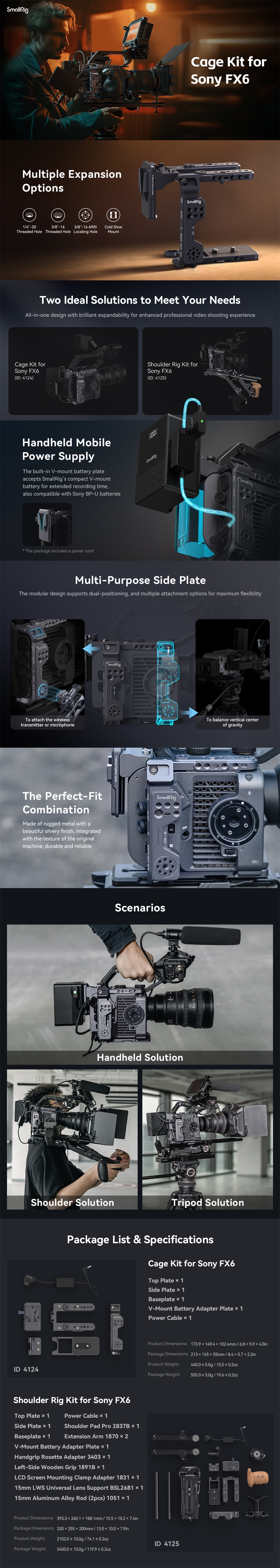 Komplet kletke SmallRig za Sony FX6 4124 je lahek in kompakten ter zasnovan za namestitev dodatne opreme in zaščito. Sestavljajo ga zgornja plošča, plošča za pritrditev baterije V, stranska plošča, osnovna plošča in napajalni kabel. Na splošno se komplet po videzu in barvi dobro ujema z modelom Sony FX6. Med temi deli je zadnja plošča za namestitev baterije V skupaj z napajalnim kablom, ki povezuje baterijo kot dodaten vir energije za podaljšanje časa delovanja. Za lažjo zamenjavo pomnilniške kartice in namestitev baterije BP-U jo je mogoče izvleči in pritrditi. Odstranljiva stranska plošča, če je nameščena blizu zadnje strani, pušča prostor za originalno držalo in podpira mikrofon, oddajnik slike itd., če pa je nameščena blizu sprednje strani, pomaga uravnotežiti fotoaparat pri fotografiranju v pokončnem načinu. Osnovna plošča pa bolje kot samo plošča za hitro odpenjanje ščiti fotoaparat pred pregrevanjem. Poleg tega sta priložena izvijač in šestiložni ključ za enostavno montažo in demontažo.
