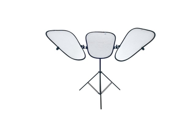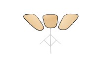Komplet Lastolite Triflector MKII z okvirjem, stojalom in ploščami Sunfire/Silver je celovita rešitev za osvetlitev, ki se pogosto uporablja v portretni, lepotni in modni fotografiji za doseganje nadzorovane, ugodne osvetlitve. Sistem vključuje zložljiv okvir, nosilni stoj in tri obojestranske reflektorske plošče, ki jih je mogoče posamično namestiti tako, da svetlobo usmerjajo točno tja, kjer je potrebna. Ta konfiguracija z več ploščami fotografom omogoča zmanjšanje senc, poudarjanje potez obraza in ustvarjanje privlačnih odsekov svetlobe v očeh fotografirane osebe.