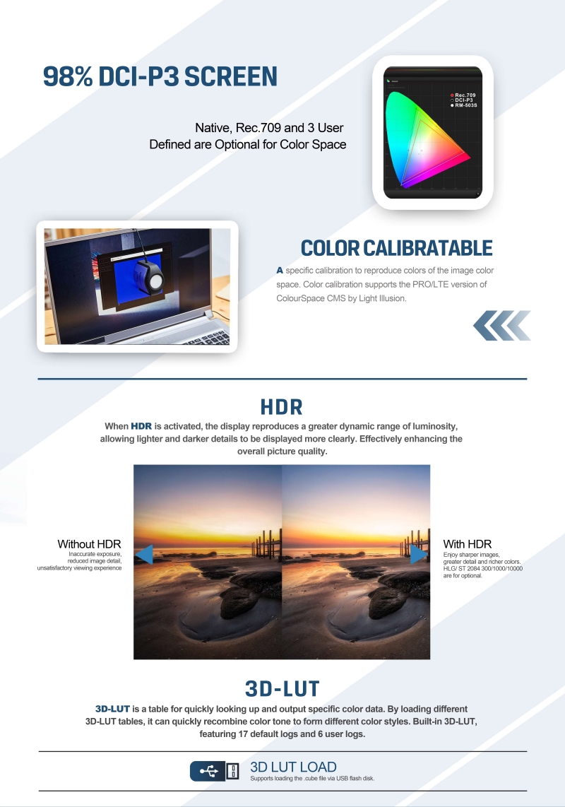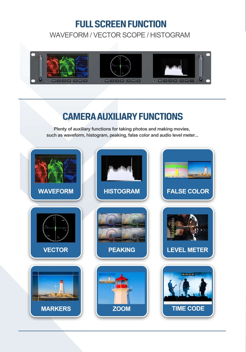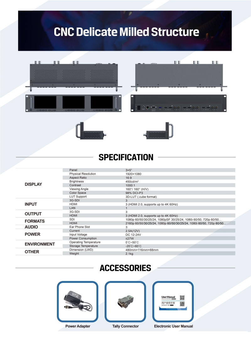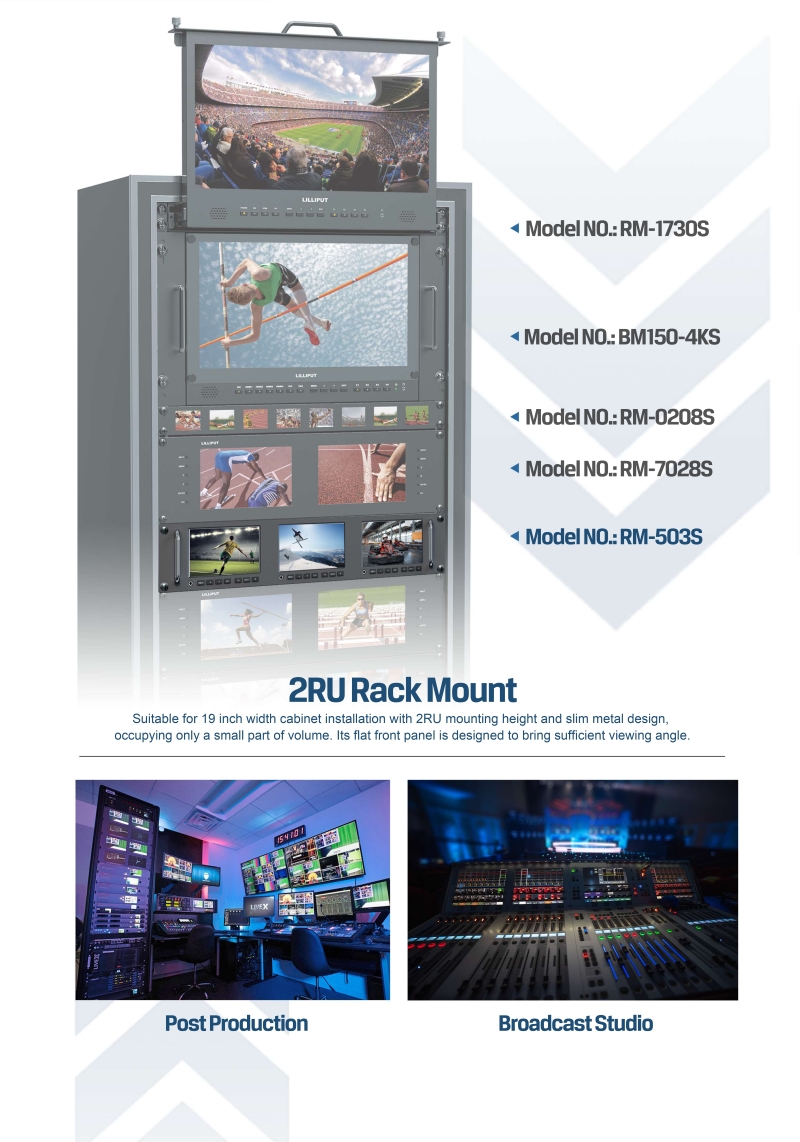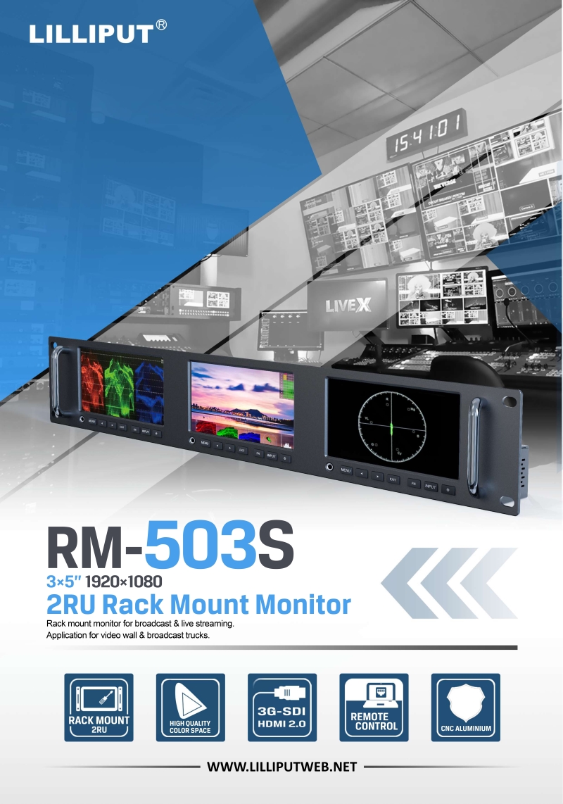 Lilliputov 5-palčni monitor RM-503S 3G-SDI/HDMI za vgradnjo v omaro ima tri 5-palčne zaslone LED s svetlostjo 450 cd/m² in ločljivostjo Full HD 1920 x 1080. Kovinsko ohišje za montažo v stojalo 2 RU ima vgrajena dva ročaja za lažjo montažo in demontažo z video stene ali mobilnega oddajnega sistema. RM-503S je z vgrajeno podporo za 3D LUT in HDR prilagojen za aplikacije za oddajanje, postprodukcijo in neposredne prenose.