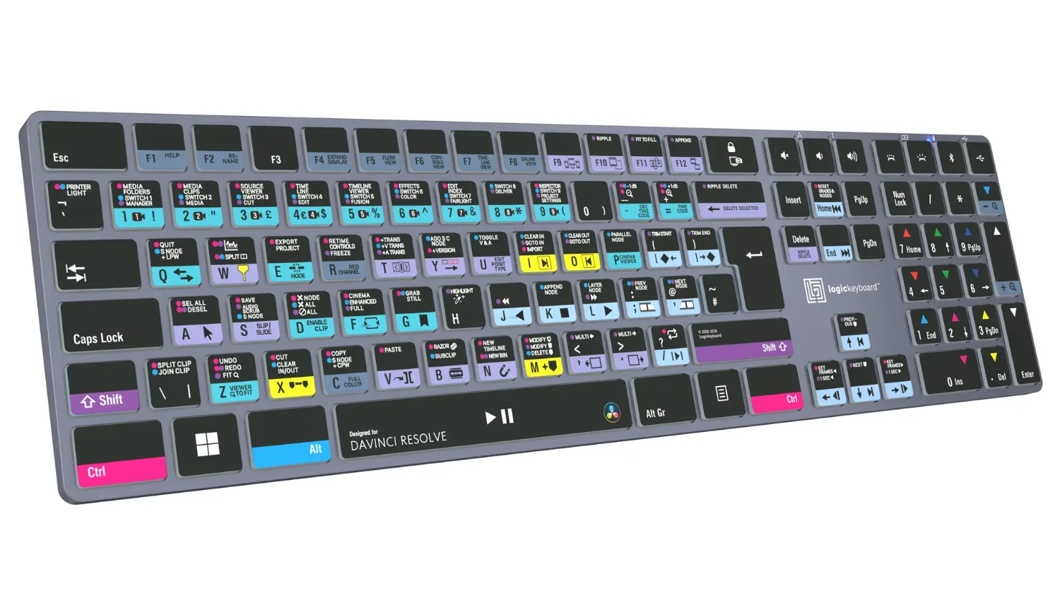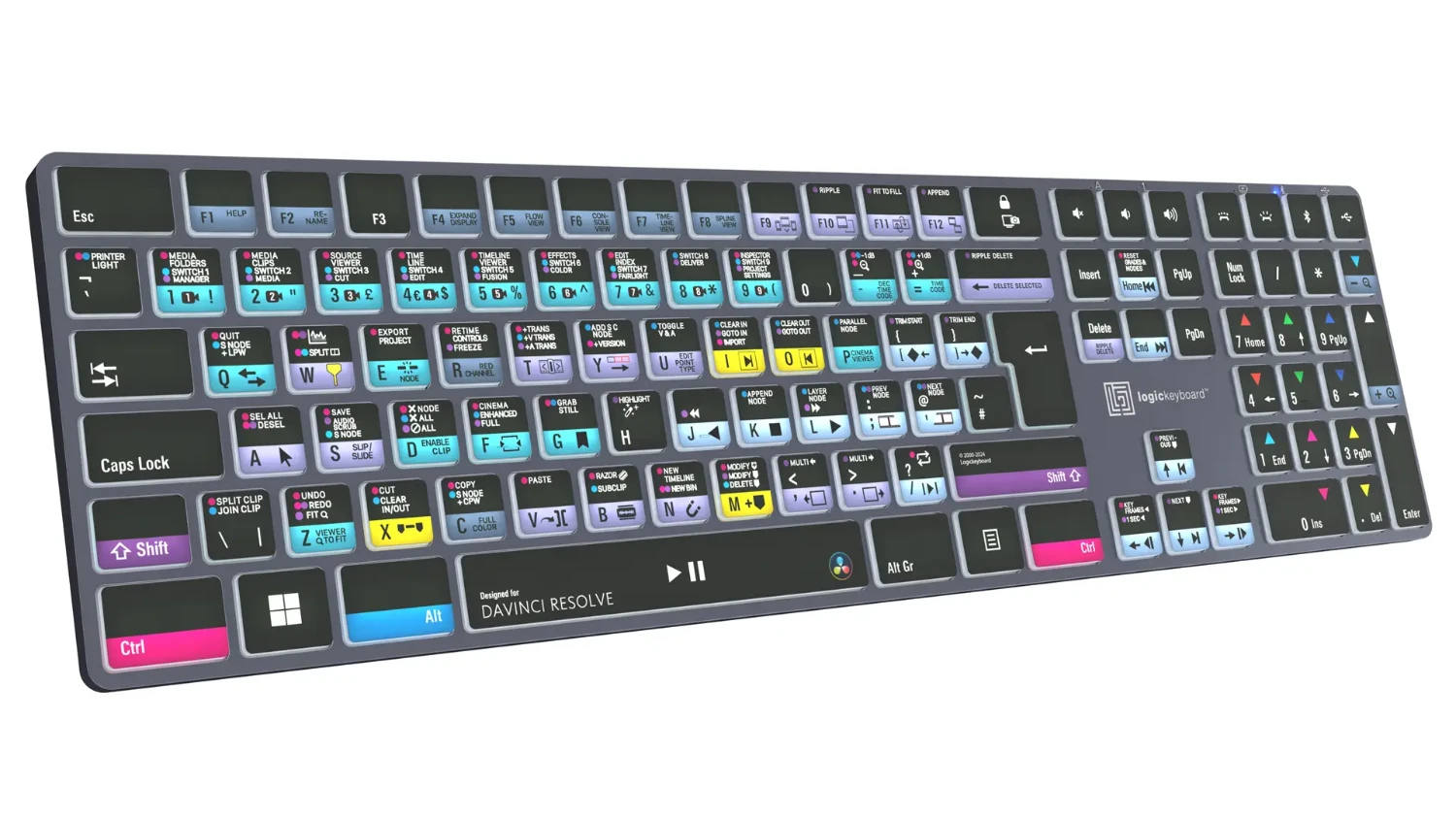 Zasnovana za DaVinci Resolve – izdelana za WindowsTa Logickeyboard je vaša prva izbira pri urejanju v DaVinci Resolve. Ukazi za bližnjice, označeni na tipkah, in njihove barvno označene definicije vas v hipu naredijo za mojstra upravljanja DaVinci Resolve. Logickeyboard je idealen za postprodukcijske studije, profesionalne montažne hiše in vse ostale, ki pridno delajo z DaVinci Resolve.