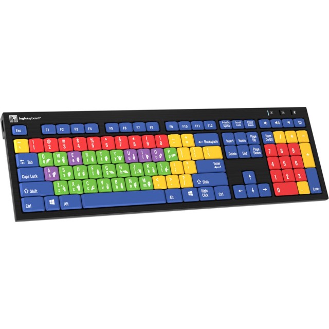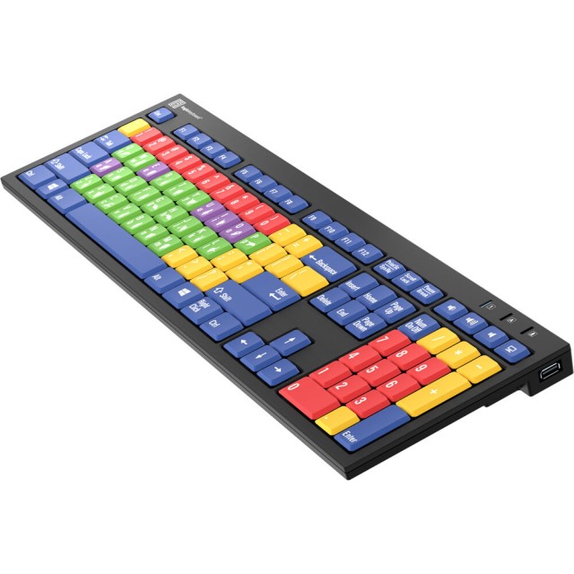 Pedagoška učna tipkovnica z barvno označenimi samoglasniki, soglasniki, številkami in funkcijskimi tipkami pomaga uporabnikom pri učenju razporeditve črk, številk in drugih tipk na standardni visokokakovostni tipkovnici.