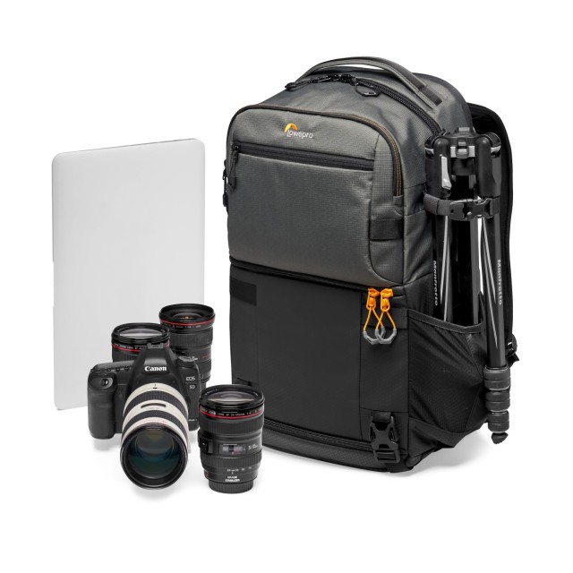 Siva nahrbtna torba Lowepro Fastpack Pro BP 250 AW III je vsestranska nahrbtna torba z dvema glavnima predelkoma, vključno s predelkom za fotoaparat na dnu nahrbtne torbe, ki lahko sprejme DSLR ali brezzrcalni fotoaparat s štirimi do petimi objektivi, vključno s pritrjenim objektivom.