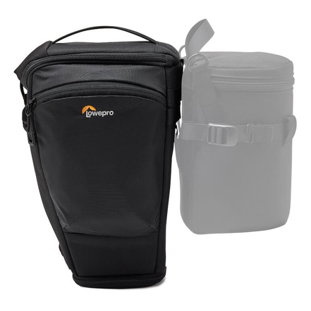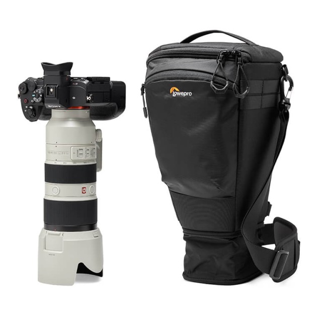 TopLoader ustreza telesu polnega okvirja z ročajem in objektivom do 70-200 mm F2,8, z razširitvijo za predpražnik objektiva. Združljiv z dodatki SlipLock, kot so ohišja za objektive