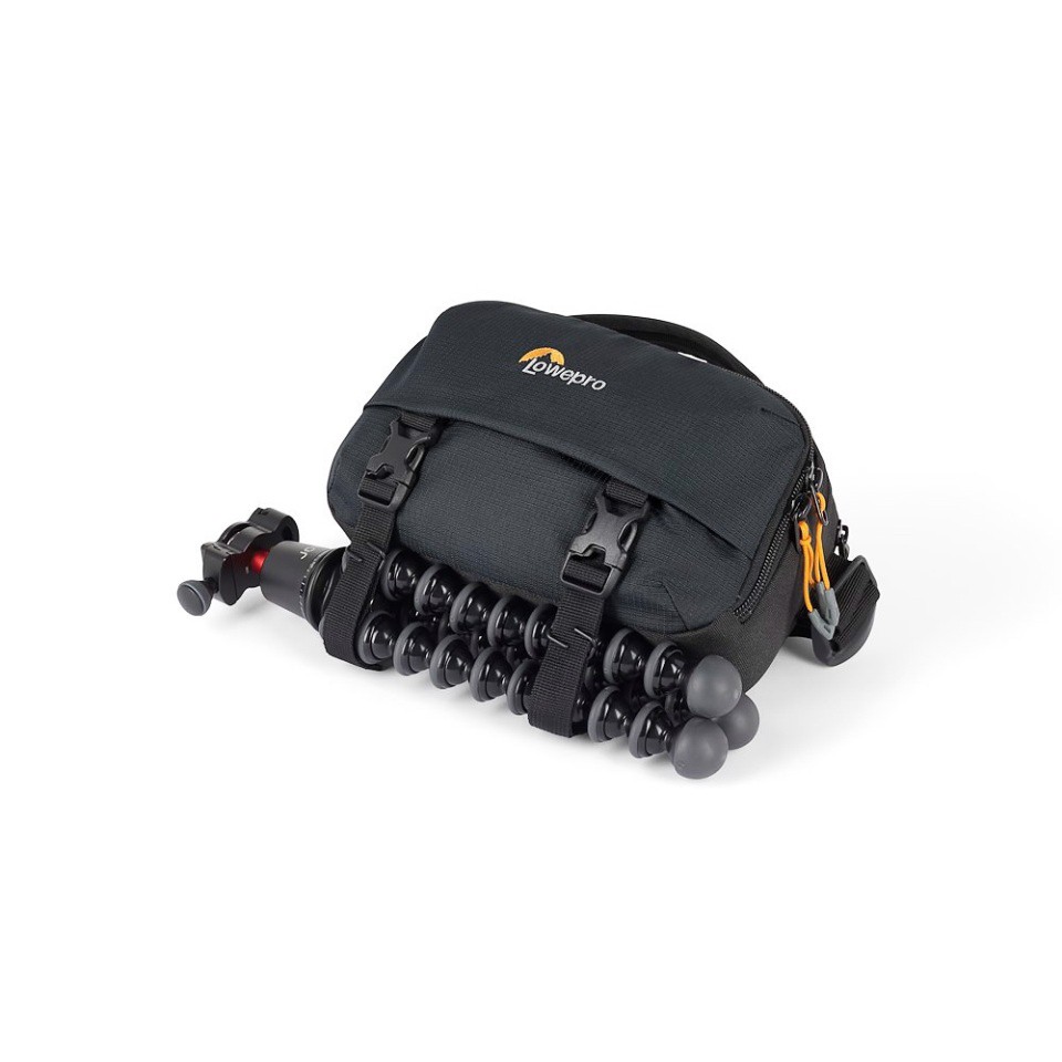 Črna torba Lowepro Trekker Lite HP 100 Hip Pack lahko sprejme majhen fotoaparat s senzorjem za izrez, kot je Sony Alpha 6400 ali podoben fotoaparat brez iskala, vendar z dvema majhnima objektivoma, ali kompaktni fotoaparat in akcijska kamera.
