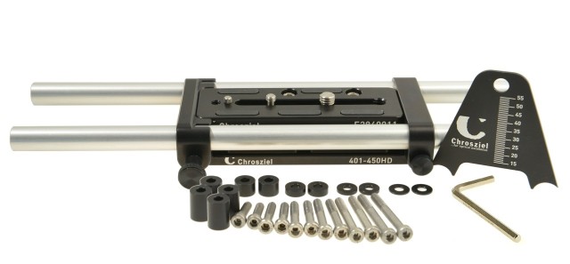 LWS - Light Weight Support 15 HD Allround, z Ø 15 mm palicami L. 310 mm, dvojnim vodenjem palic in objemko, nastavljiv za vse fotoaparate z optično višino med 26,5 in 72,5 mm (razdalja med središčem objektiva in dnom fotoaparata). Priloženi so distančniki (pari) 1, 2, 4, 8, 2 x 16 mm, komplet vijakov, tabela z višinami fotoaparatov in imbusni ključ. (Alternativno se lahko uporabljajo vse Chroszielove platforme za kamere serije 401-4xx.)