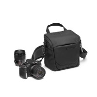 Manfrotto Advanced Holster L III je navpična torba z zgornjim polnjenjem, ki je zgrajena okoli oblazinjenega jedra velikosti 18 × 12,5 × 28 cm, v katerega se lahko shrani profesionalna DSLR-kamera (5D, D850) z nameščenim objektivom 70-200 f/2,8. Pokrov se odpre stran od telesa, kar omogoča enoročno izvlečenje, rdeč elastični trak na sprednji strani pa pritrdi Befree ali mini stativ. Dva notranja modularna žepa omogočata urejeno shranjevanje rezervnih baterij in CF/SD kartic, stranska raztegljiva žepa pa sta namenjena za pokrovčke objektivov ali kable. Možnosti nošenja vključujejo oblazinjeni zgornji ročaj, snemljiv ramenski pas ali pasne zanke za pritrditev na bok. Vodoodbojen poliester 600D in skrit dežni pokrov ščitita pred dežjem. S težo 340 g je torba idealna za športne, naravoslovne ali dogodkovne fotografe, ki zahtevajo hitrost brez žrtvovanja zaščite.