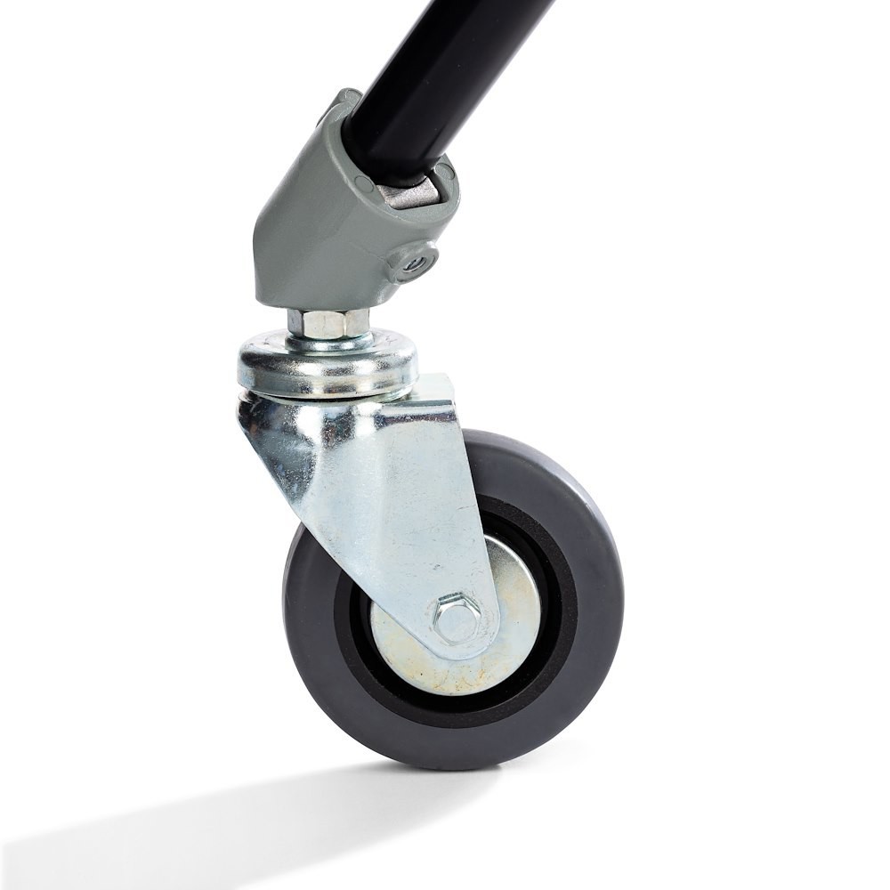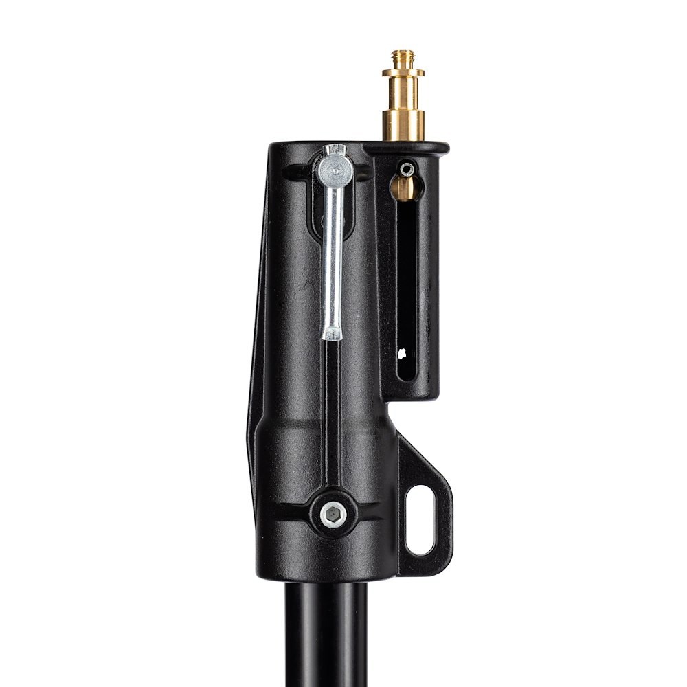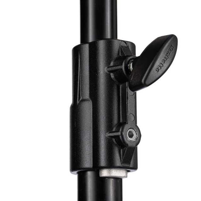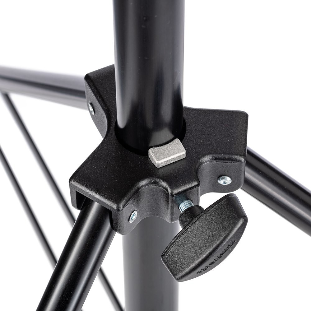 Vključuje izravnalno nogo, ki omogoča stabilno uporabo na neravnih površinah, vključno s stopnicami ali nakloni. Stojalo podpira največjo obremenitev 15 kg in se razteza do 212 cm, zaprta dolžina pa je 112 cm, kar omogoča enostavno shranjevanje in prevoz. Dvojna možnost pritrditve na vrhu – 1 1/8" (28 mm) ženski sprejemnik in 5/8" (16 mm) moški sornik – zagotavlja združljivost s široko paleto svetlobnih glav in dodatkov.