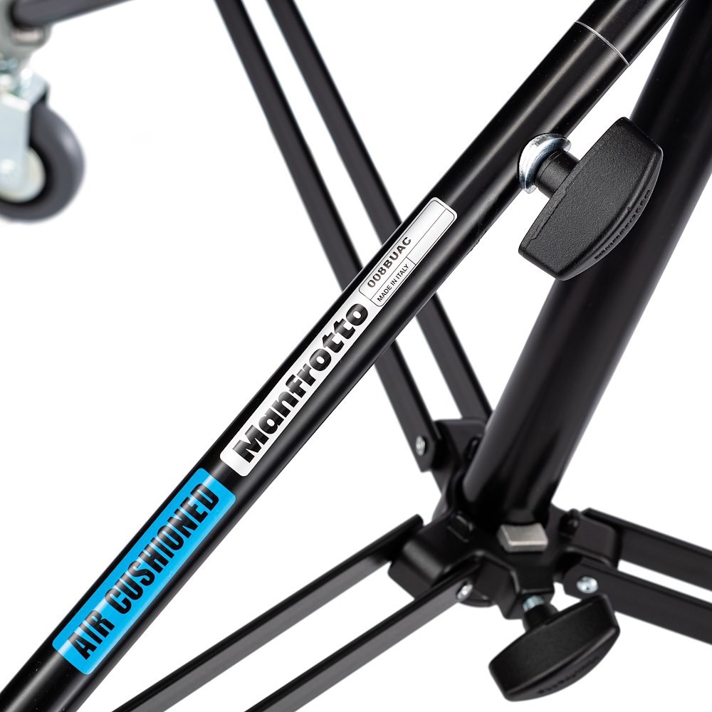 Manfrotto 008BUAC je črn, dvodelni aluminijasti stojalo z zračno blazino in izravnalno nogo, ki nosi do 15 kg in je idealno za profesionalno studijsko osvetlitev. Stojalo združuje lahkotnost in prenosljivost s profesionalno trdnostjo in vsestranskostjo, zaradi česar je primerno tako za delo v studiu kot na terenu.
