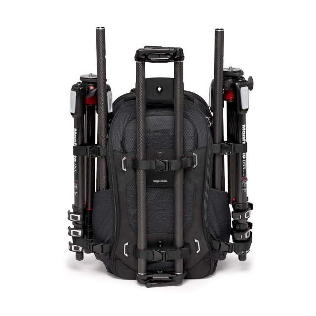 V nahrbtnik lahko pospravite profesionalno opremo, kot so DSLR-ji, CSC-ji, več objektivov, manjši zložljivi droni, stabilizatorji in podobna oprema. Poseben predel za stabilizatorje je ločen od glavnega žepa