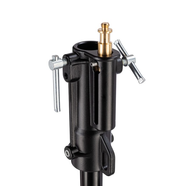 Manfrotto 142B je črna različica legendarnega Manfrotto podaljška za stojala za težka bremena. Dva debela aluminijasta dela (en podaljšek) z velikimi zapornimi obroči zagotavljajo trdno maksimalno višino 210 cm, hkrati pa podpirajo polno obremenitev studia. Spodnji del je 28 mm (1-1/8″) Junior moški nastavek, zgornji del pa je 28 mm Junior ženski sprejemnik + 16 mm Baby nastavek + 3/8″ navoj. Ko potrebujete 12×12 okvir, veliko HMI ali softbox, ki je višji od vašega navijalnega ali C-stojala, preprosto namestite 142B na vrh in ste pripravljeni.