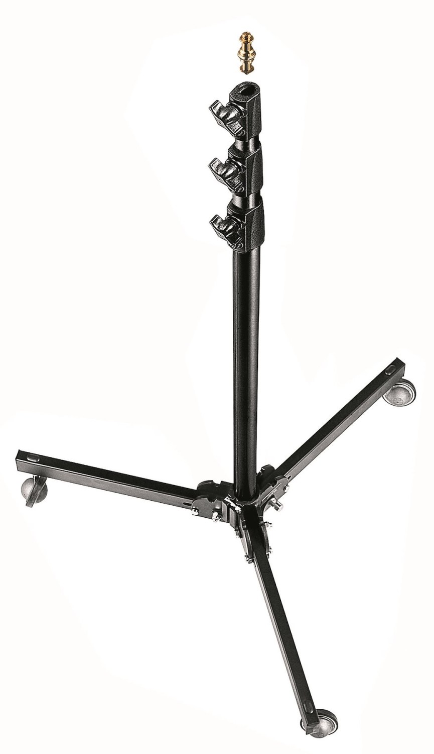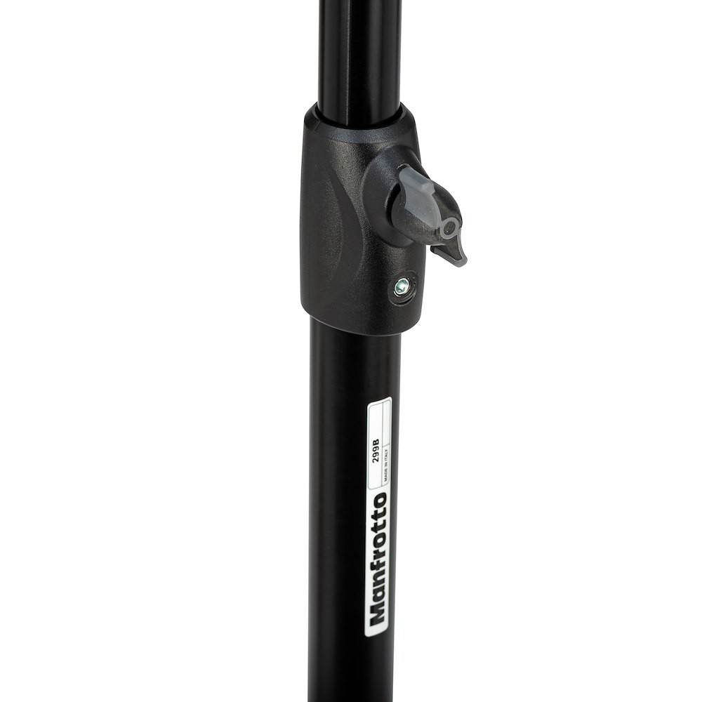 Manfrotto 299B združuje težko črno jekleno podnožje s tremi lahkimi aluminijastimi deli in dvema podstavkoma. Pravokotne noge zagotavljajo izjemno stransko stabilnost, izravnalna noga kompenzira neravne površine, visokokakovostna 80-milimetrska zavora pa omogoča gladko premikanje brez dvigovanja. Na vrhu je 17,5 mm vtičnica ter 3/8″ in 1/4″ navoji, poleg tega je običajno priložen klasični Manfrotto Art. 013 Baby-to-Junior adapter. S težo 4,8 kg je enostaven za premikanje, vendar trden kot skala pod dejanskimi studijskimi obremenitvami.
