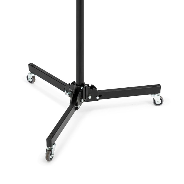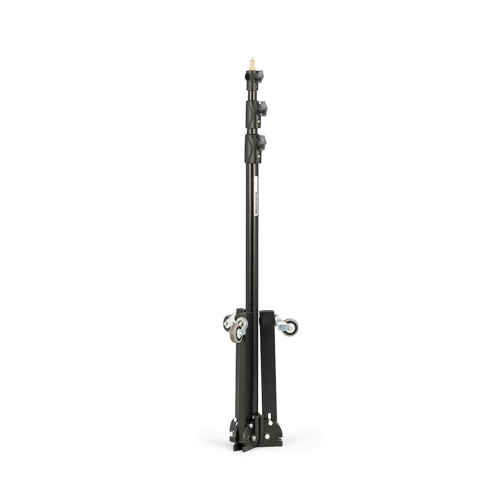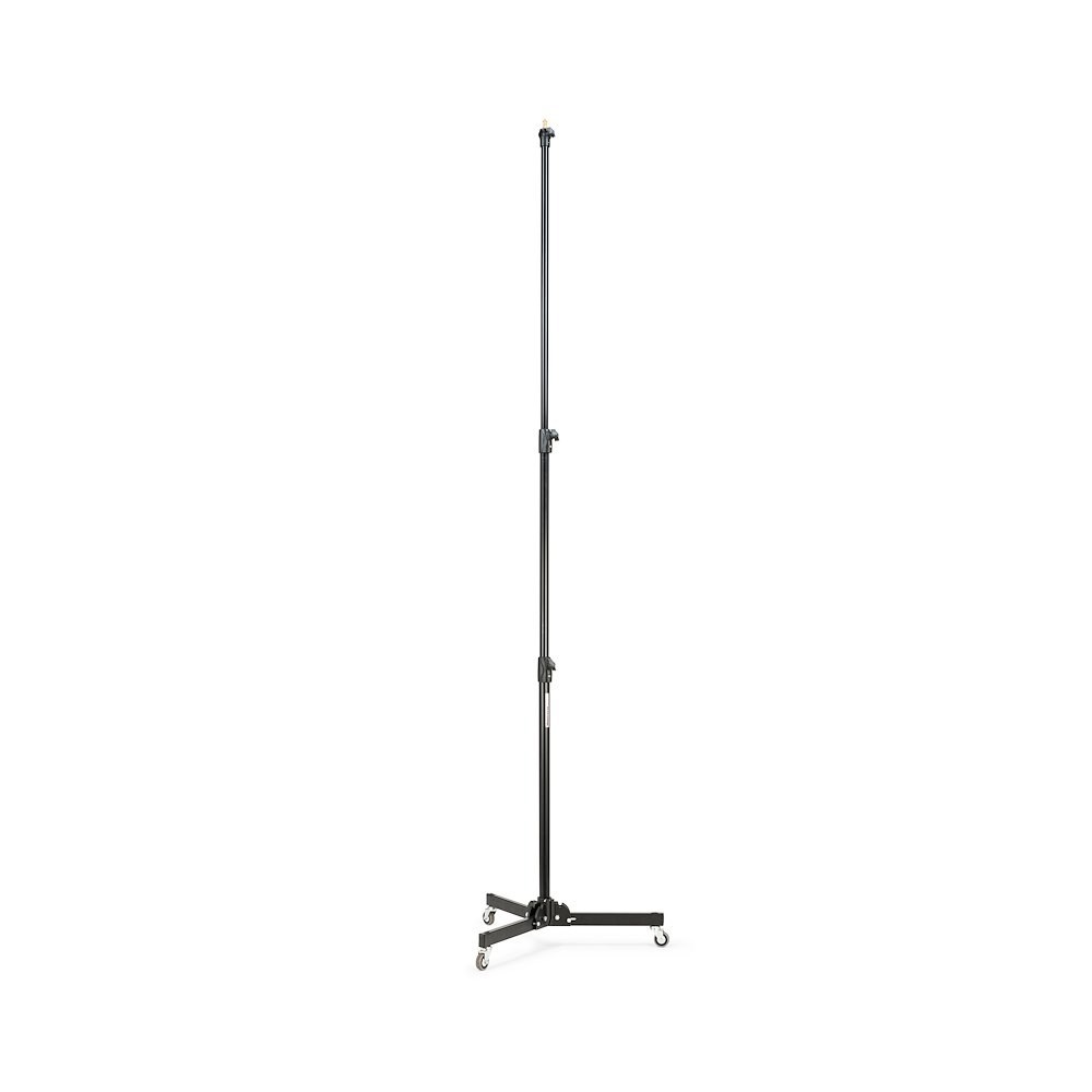 Manfrotto 299B je klasičen črn jekleni stojalo z nizko podlago, srebrnimi anodiziranimi aluminijastimi podstavki, zavornimi kolesi in eno izravnalno nogo – doseže višino 272 cm in varno nosi 12 kg (2,2 kg pri polni raztegnitvi). Široka, stabilna podlaga in vgrajena kolesa ga naredijo idealno stojalo za studijsko osvetlitev, velike softbokse ali podlage za ozadje.
