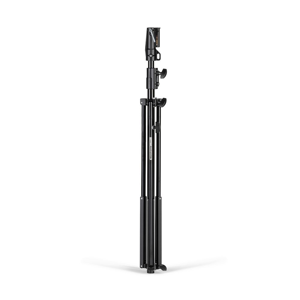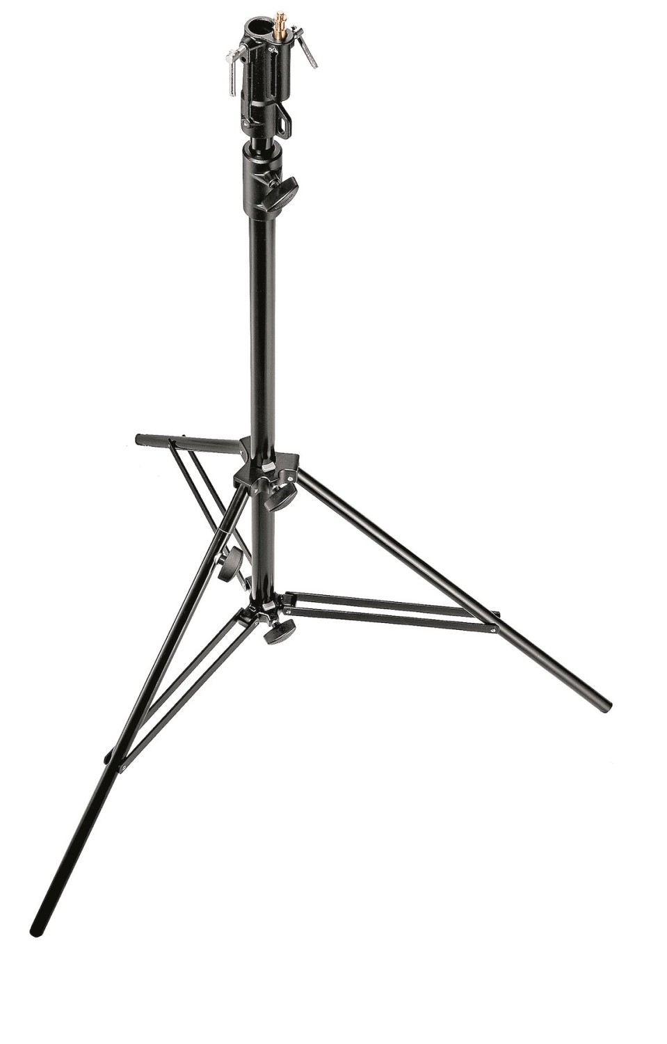 Manfrotto 008BSU črni cinkov jekleni junior stojalo je dvodelno, 1-stopenjski stojalo za težka bremena, ki se razteza od 116 do 216 cm z nosilnostjo 30 kg, dvojno ojačanimi nogami, izravnalno nogo, univerzalnim 28 mm vtičnim nastavkom + 16 mm glavo s čepom in črno cinkovo površino – zagotavlja trdno stabilnost za srednje svetilke, modifikatorje ali boom mikrofone v studiu ali na lokaciji.
