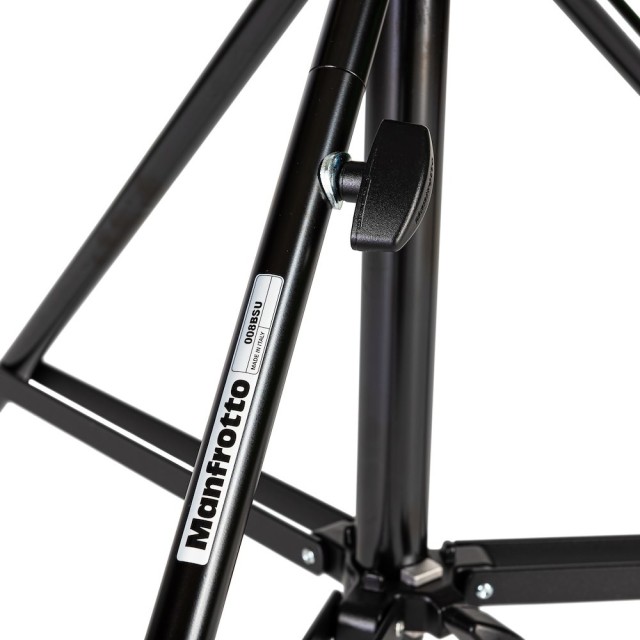 Stojalo Manfrotto 008BSU Junior združuje robustno vzdržljivost in pametno inženirstvo v črnem pocinkanem okvirju. Dva dela z enim dvigalom se z zaponkami gladko raztegnejo do maksimalne višine 216 cm, medtem ko dvojno ojačene okrogle noge in 110 cm podstavek zagotavljajo, da se pod obremenitvijo 30 kg ne upogiba. Univerzalna glava tipa 14 ima 28 mm žensko vtičnico in 16 mm baby čep z varnostnim zatičem za katero koli standardno pritrditev.