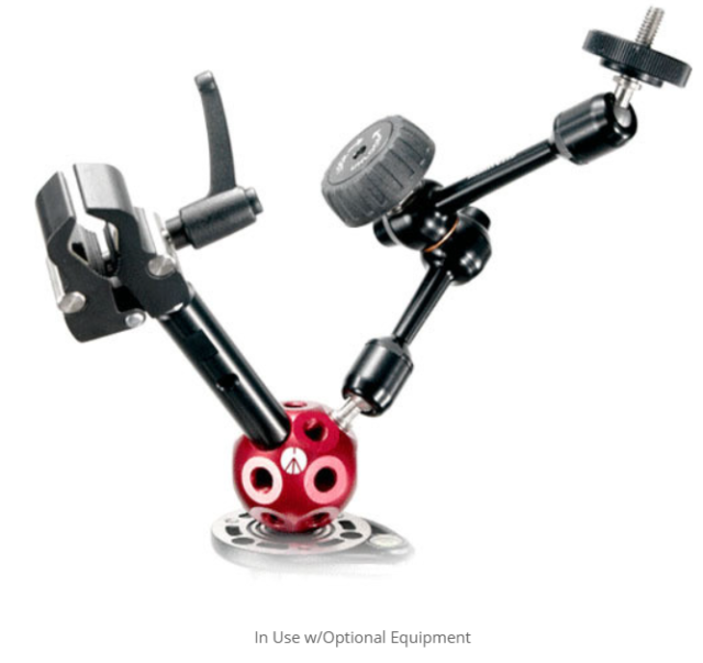 Manfrotto Dado Kit ustvari 360° večročno osrednjo točko iz enega samega stojala ali Super Clamp. Rdeča aluminijasta krogla ima šest 3/8"-16 ženskih vtičnic, razporejenih v natančnem geometrijskem vzorcu, ki sprejemajo šest priloženih črnih 3" (7,6 cm) palic – vsaka z 3/8"-16 ženskimi navoji na obeh koncih. Dodajte dodatne palice Dado, Magic Arms ali čepe, da namestite LED-e, mikrofone, goboje ali reflektorje v kateri koli smeri.