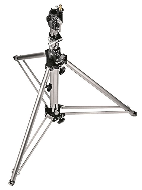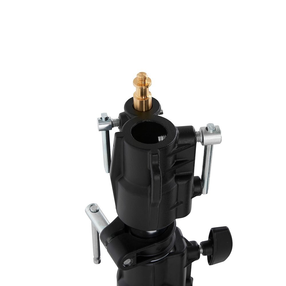 Manfrotto 070CSU je klasični stojalo, ki ga najdemo na odrih in v studijih po vsem svetu. Njegova celo jeklena, kromirana konstrukcija in dvojna opora nog mu dajejo ogromno nosilnost 40 kg, hkrati pa ohranja nizko težišče. Ena noga je teleskopsko nastavljiva za hitro izravnavanje na neravnih tleh ali odrih, široka podlaga 105 cm z nogami premera 30 mm pa zagotavlja trdno delovanje tudi pod težkimi 2 kW sledilnimi žarometi ali velikimi napravami. Univerzalna glava sprejema 28 mm junior sprejemnike, 16 mm Baby zatiče ali neposredno 3/8″ vijakovo pritrditev, opcijska kolesa 103/104/104G pa ga v nekaj sekundah spremenijo v stojalo na kolesih.