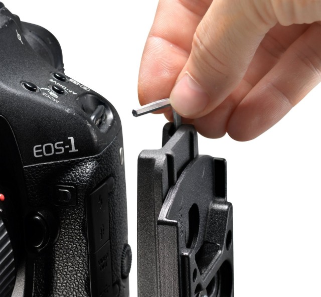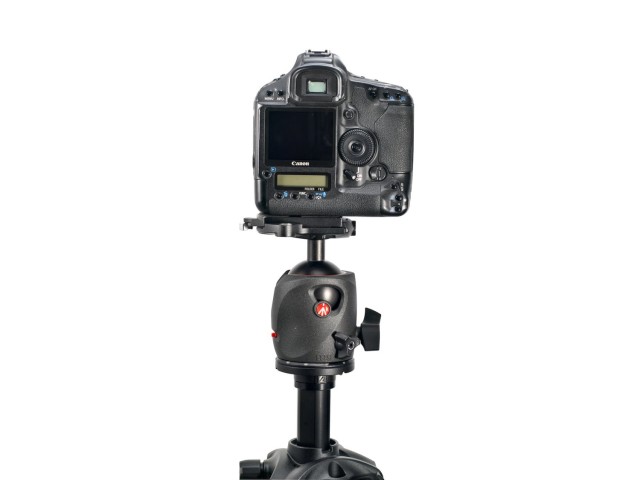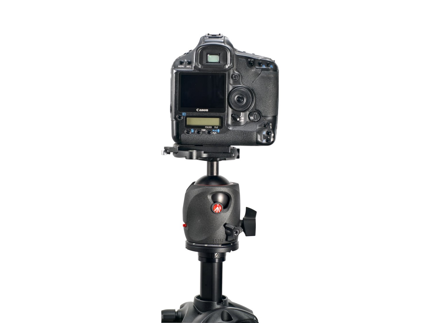 Manfrotto MS050M4-RC4 L nosilec se zaklene prek sistema RC4 s priloženo ploščo 410PL, ki ponuja veliko stično površino in dvojne varnostne ključavnice za ničelno drsenje pri obremenitvah do 15 kg. Magnezijevo ohišje ima modelsko specifične protivrtilne zatiče in gumijaste podložke, ki se prilegajo dnu kamere in preprečujejo vrtenje med 90° zamahi. Offsetna zasnova ohranja poravnavo optične osi nad središčem stativa v obeh usmeritvah, kar odpravlja potrebo po ponovni kompoziciji po vrtenju.