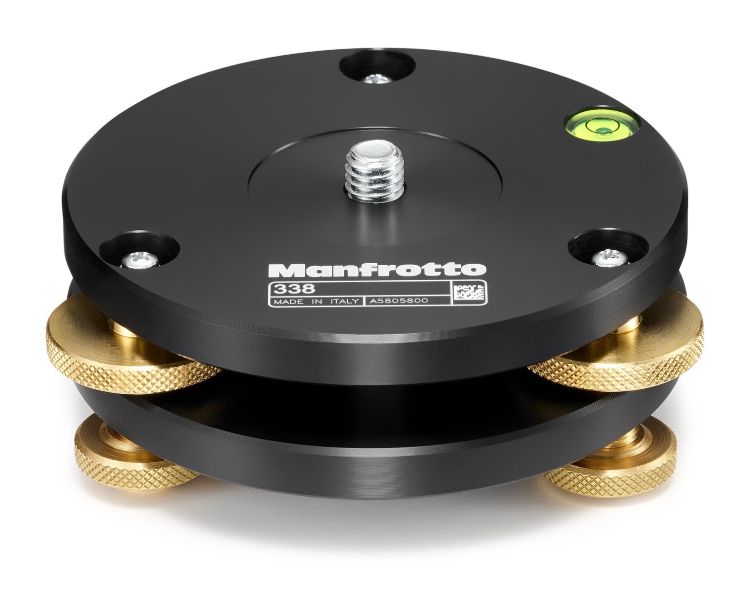 Manfrotto 338 izravnalna podlaga omogoča natančno izravnavanje kamere na stativih brez vgrajenih izravnalnih mehanizmov, opremljena je s tremi nastavnimi gumbi, zapornimi obroči in vgrajeno vodno tehtnico.