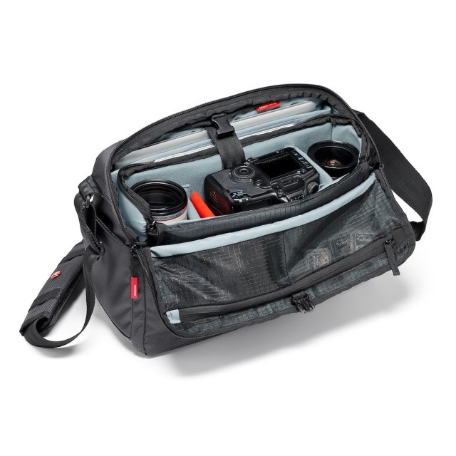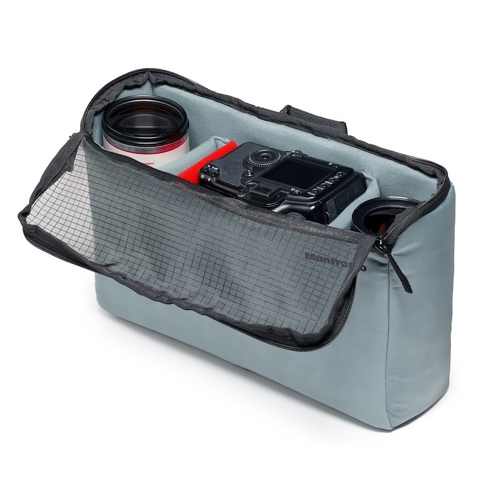 Manfrotto Manhattan Speedy-30 Messenger (MB MN-M-SD-30) je elegantna, urbana siva torba za fotoaparat, v katero se lahko shrani polnoformatni DSLR (npr. Canon 5D Mark IV) s pritrjenim objektivom 70–200 mm f/2,8 ter 3–4 dodatnimi objektivi, 14-palčnim prenosnim računalnikom in 9,7-palčnim tabličnim računalnikom, z odstranljivo vložkom Flexy Camera…