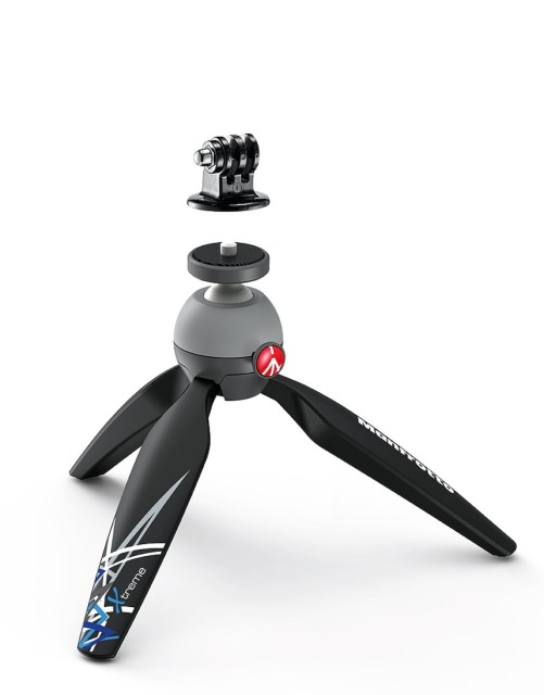 Manfrotto PIXI Xtreme Mini Tripod z GoPro adapterjem: Ultraprenosni 6,3-palčni namizni/ročni stativ s pritiskalnim kroglasnim glavo, 1/4"-20 vijakom, gumijastimi nogicami in namenskim GoPro nosilcem – nosilnost 2,2 lb v 6,9 oz paketu iz nerjavečega jekla/Adapto.