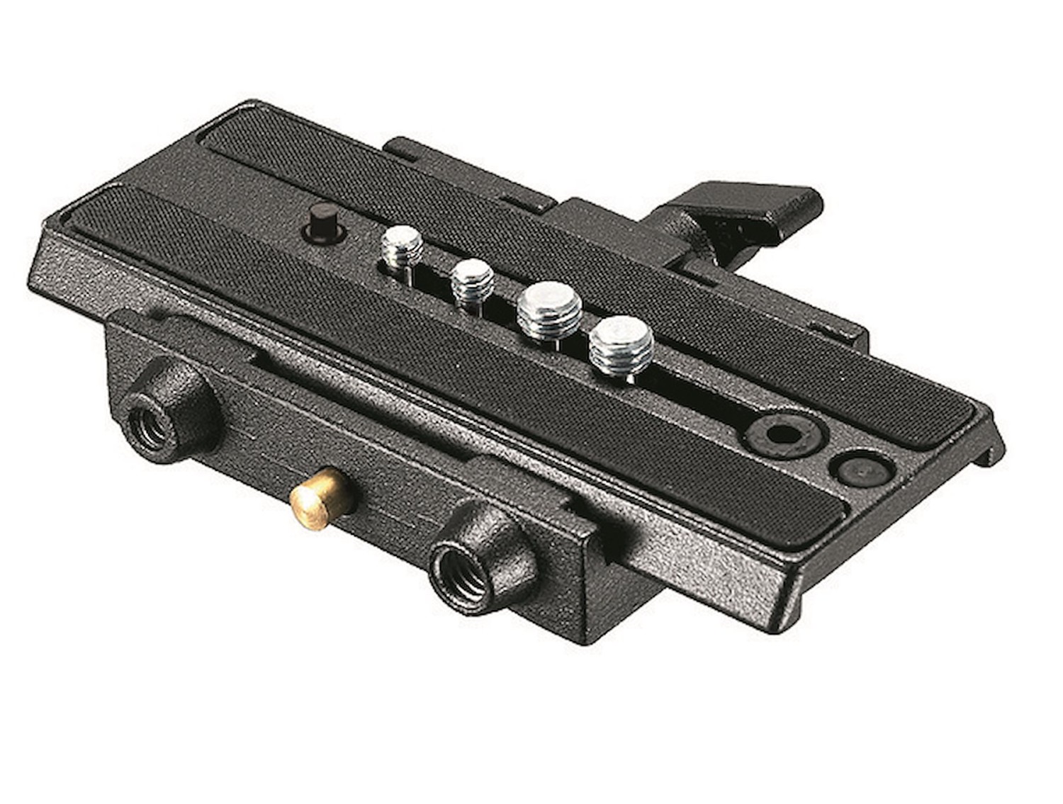 Manfrotto 357-1 je kompletna adapterja: robustna aluminijasta podlaga z velikim zapornim ročajem in sekundarnim varnostnim zatičem ter znana drsna plošča 357PLV (dolžina 120 mm, hod 80 mm). Ploščo je mogoče opremiti z vijakom 1/4″-20 ali 3/8″-16 (oba sta priložena) in ima izvlečni video zatič, ki preprečuje vrtenje na profesionalnih videokamerah. Izjemno dolg hod omogoča enostavno uravnoteženje težkih oprem z matte boxi, follow-focusom in dolgimi objektivi v nekaj sekundah. Nosilec se namesti neposredno na katero koli Manfrotto video glavo, ki uporablja sistem 357.