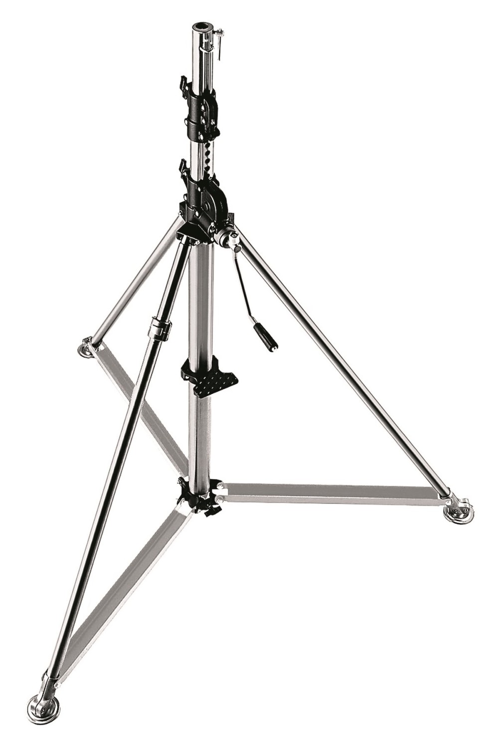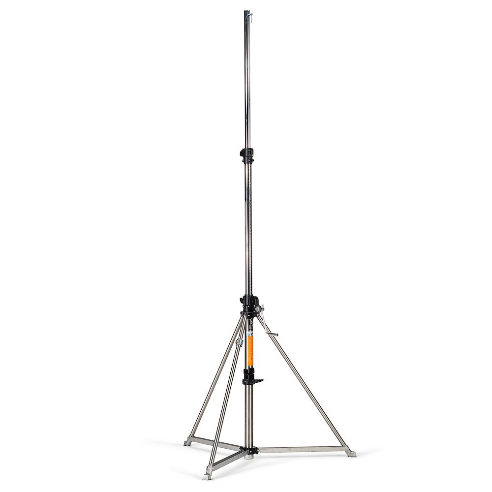 Manfrotto 387XU Stainless Steel Super Wind Up je vrhunski stojalo za težka bremena v studiu: TÜV-certificirano, s kapaciteto 80 kg, 3,66 m visoko kromirano stojalo s trojnimi navojnimi koloni (70/60/50 mm), dvema dvigalkama, izravnalno nogo in 180 cm podstavkom.