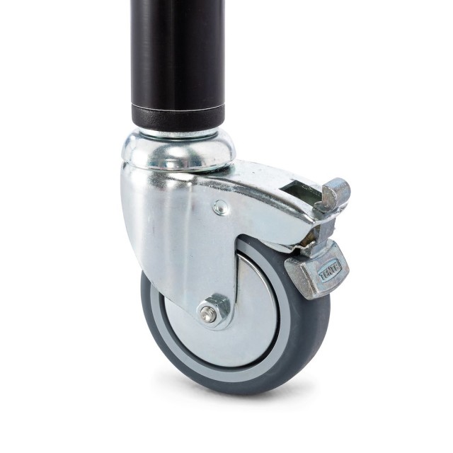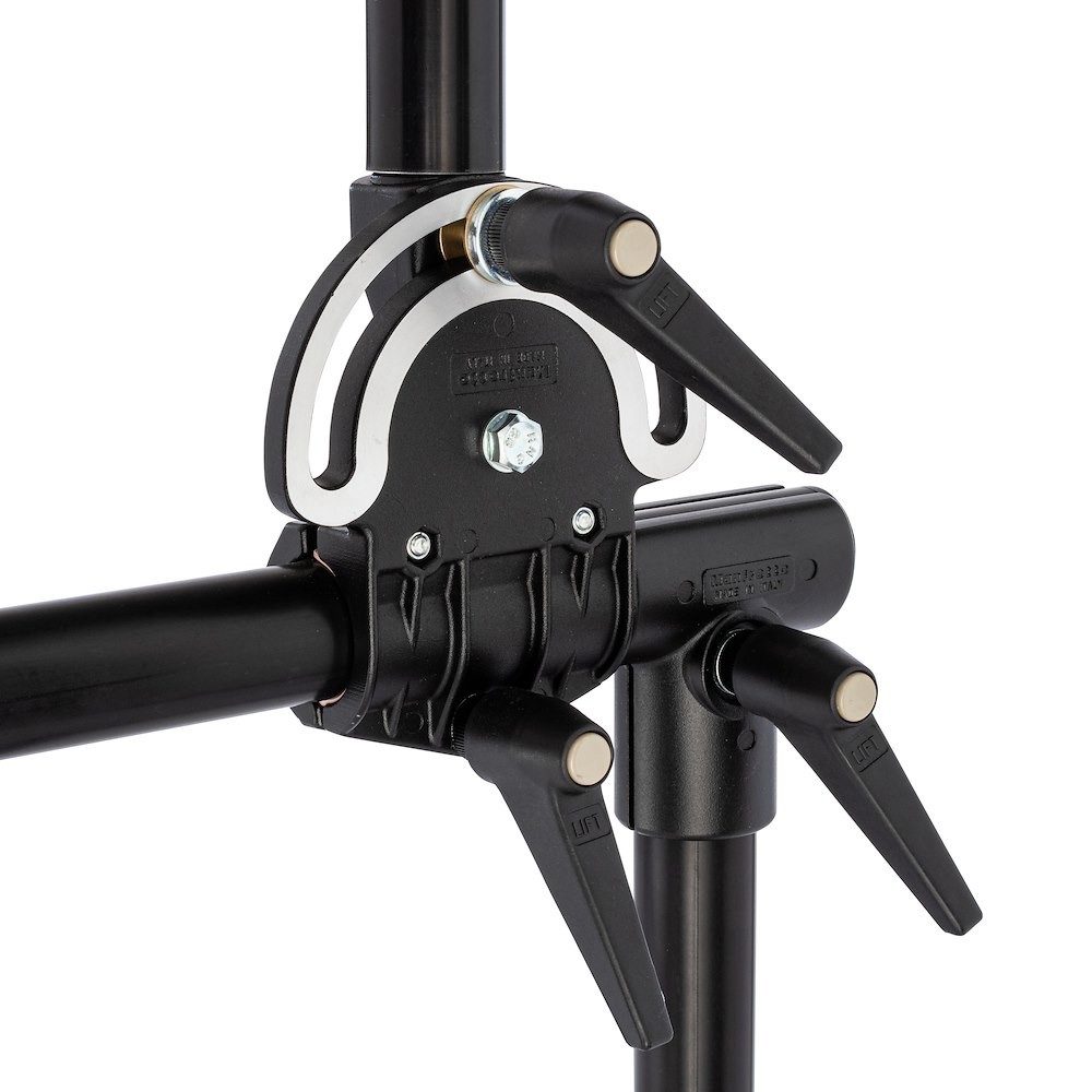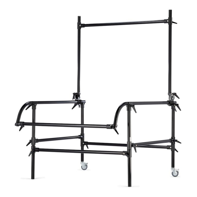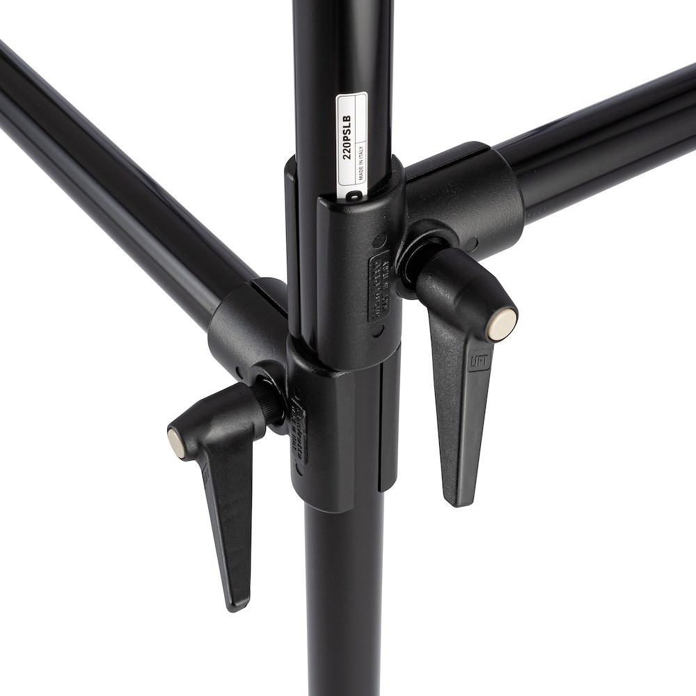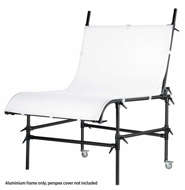 Manfrotto 220PSLB ima mat črno 200 × 122 cm (6,5 × 4 ft) neprosojno akrilno ploščo, nameščeno na robustnem aluminijastem okvirju, ki se sestavi v nekaj minutah brez orodja. Zadnja plošča se nagiba od 0° (ravno) do 90° (navpično) z gladkimi zapornimi gumbi, kar omogoča ustvarjanje brezšivnih neskončnih zalivov ali dramatičnih nadglavnih kotov do višine 193 cm. Z delovno višino 83 cm je idealna za fotografiranje v stoje ali sede, medtem ko jo dodatna zavora na kolesih (220WC) in prosojna perspex pokrivna plošča (220PX) spremenita v popolno svetlobno mizo. Idealna je za fotografiranje za e-trgovino, kataloge ali hrano, kjer je potrebno čisto, brez senčnega črnega ozadja – trpežna, stabilna in neskončno konfigurativna.