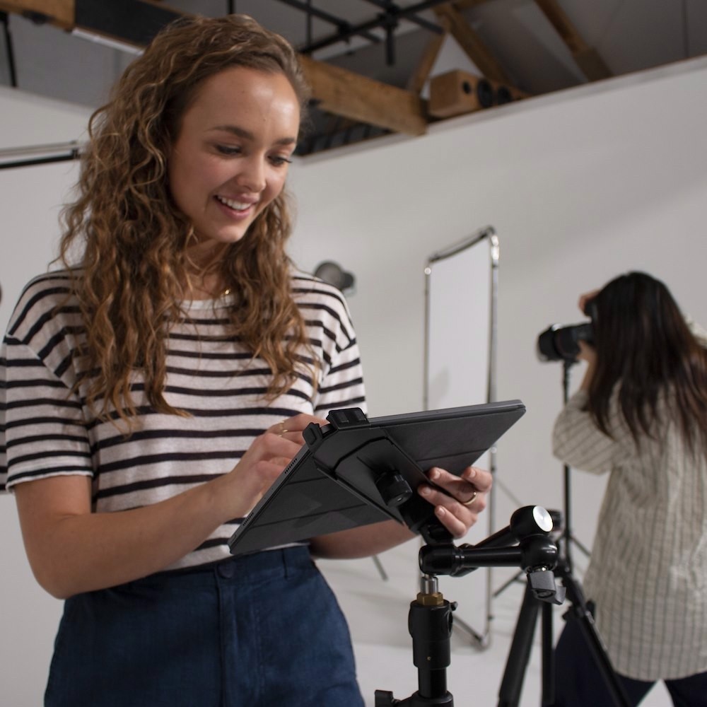 Manfrotto TetherGear Tablet Holder spremeni kateri koli 9–13-palčni tablični računalnik (iPad Pro, Surface, Galaxy Tab) v trdno poljsko monitor ali kontrolno postajo. Vzmetni ročaji z gumiranimi ročaji se razširijo z enim ergonomskim gumbom in se zaklenejo brez zdrsa. Priložena aluminijasta adapter plošča ima 1/4"-20 in 3/8"-16 notranje navoje, ARRI-style protivrtilne zatiče in Arca-Swiss dovetail za neposredno montažo na Magic Arms, stative ali nagibne glave. S težo le 440 g je idealna rešitev za ustvarjalce vsebin, DIT-je ali video nastavitve, ki potrebujejo hitro, zanesljivo integracijo tabličnega računalnika brez dodatne teže.