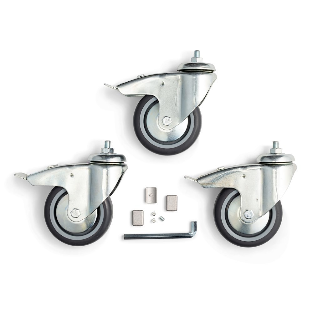 Manfrotto 104G je komplet treh 100-milimetrskih koles z zavoro in navojem M10, ki nosijo skupno 100 kg tovora in omogočajo gladko, zaklenljivo vožnjo za večino stojal z navojem M10 (npr. 087NW, 475B, 269HDB) v robustnem 3-kilogramskem studijskem vozičku.