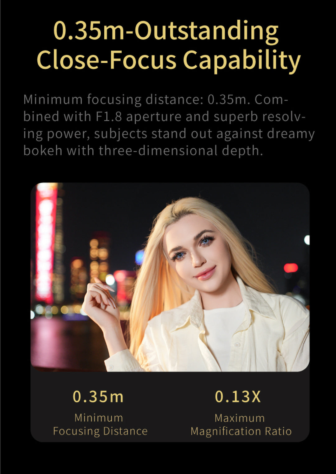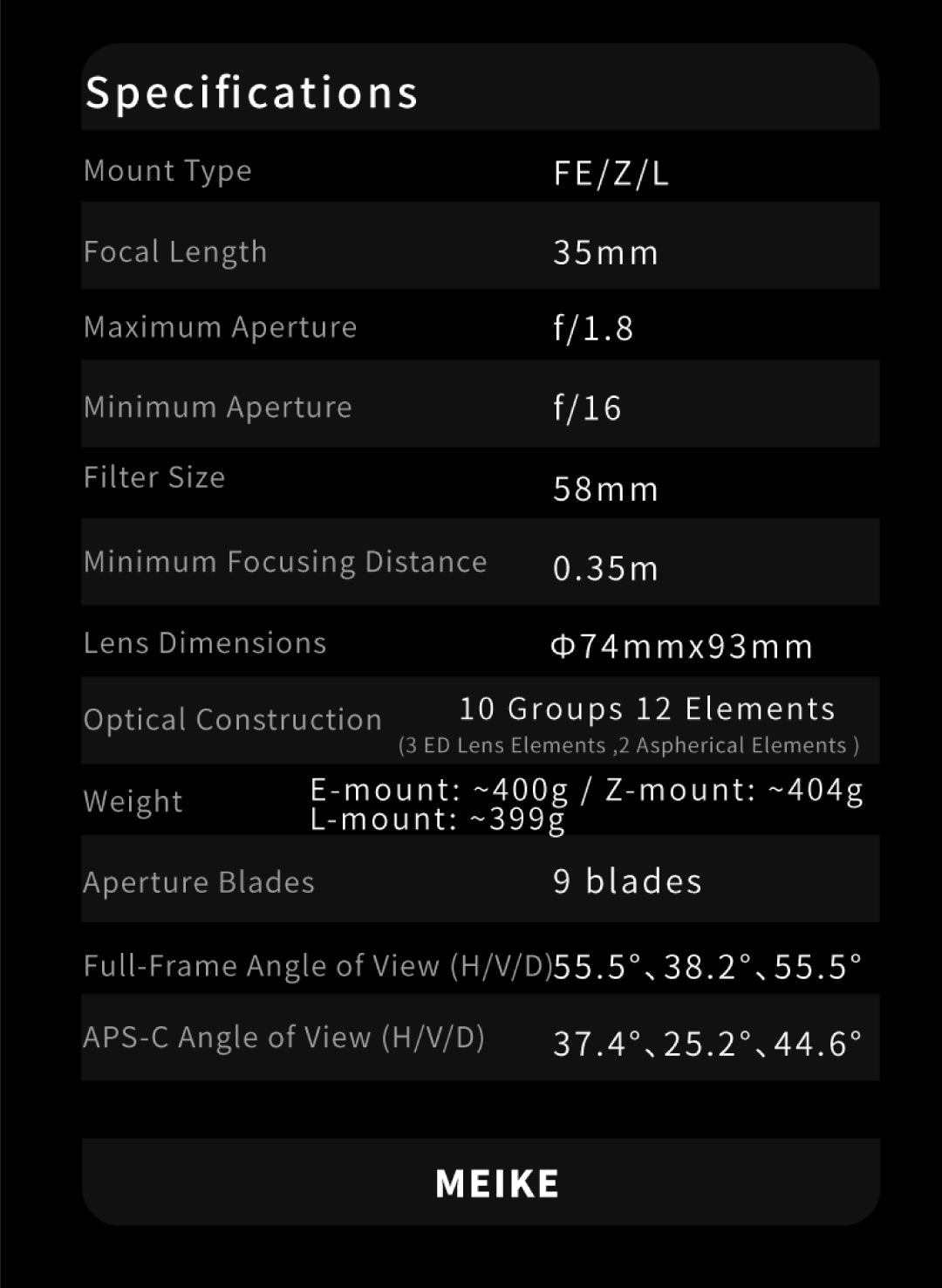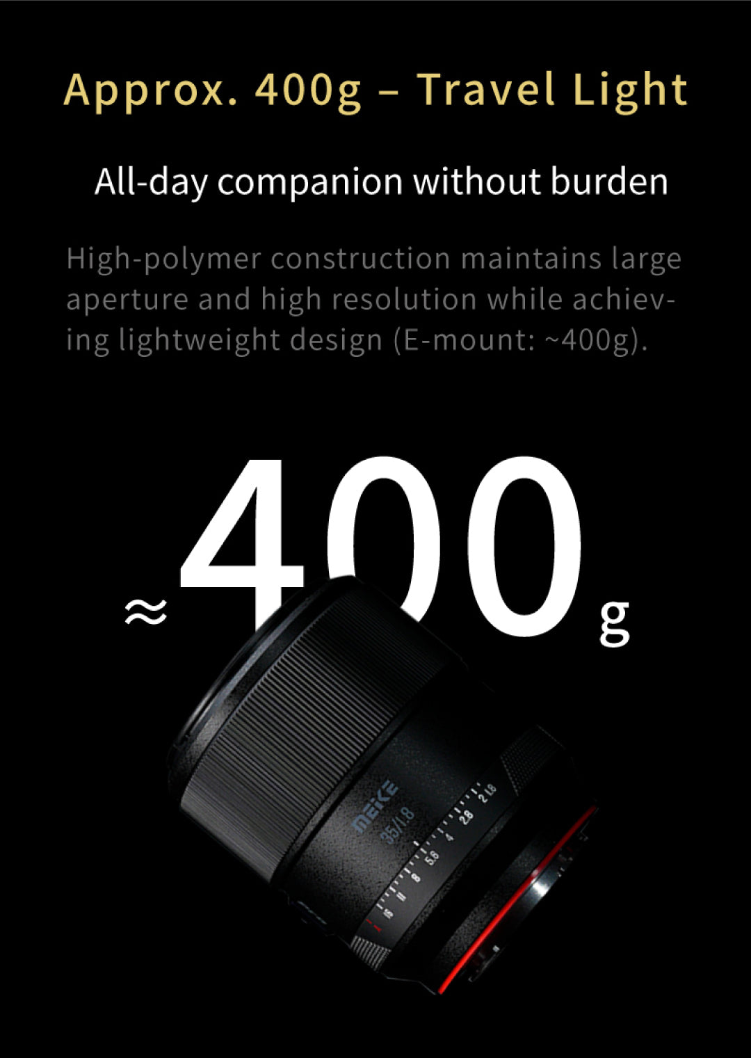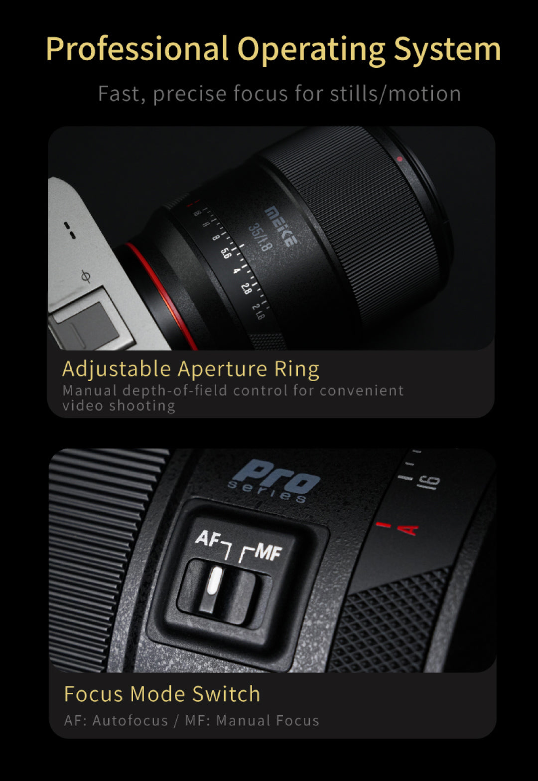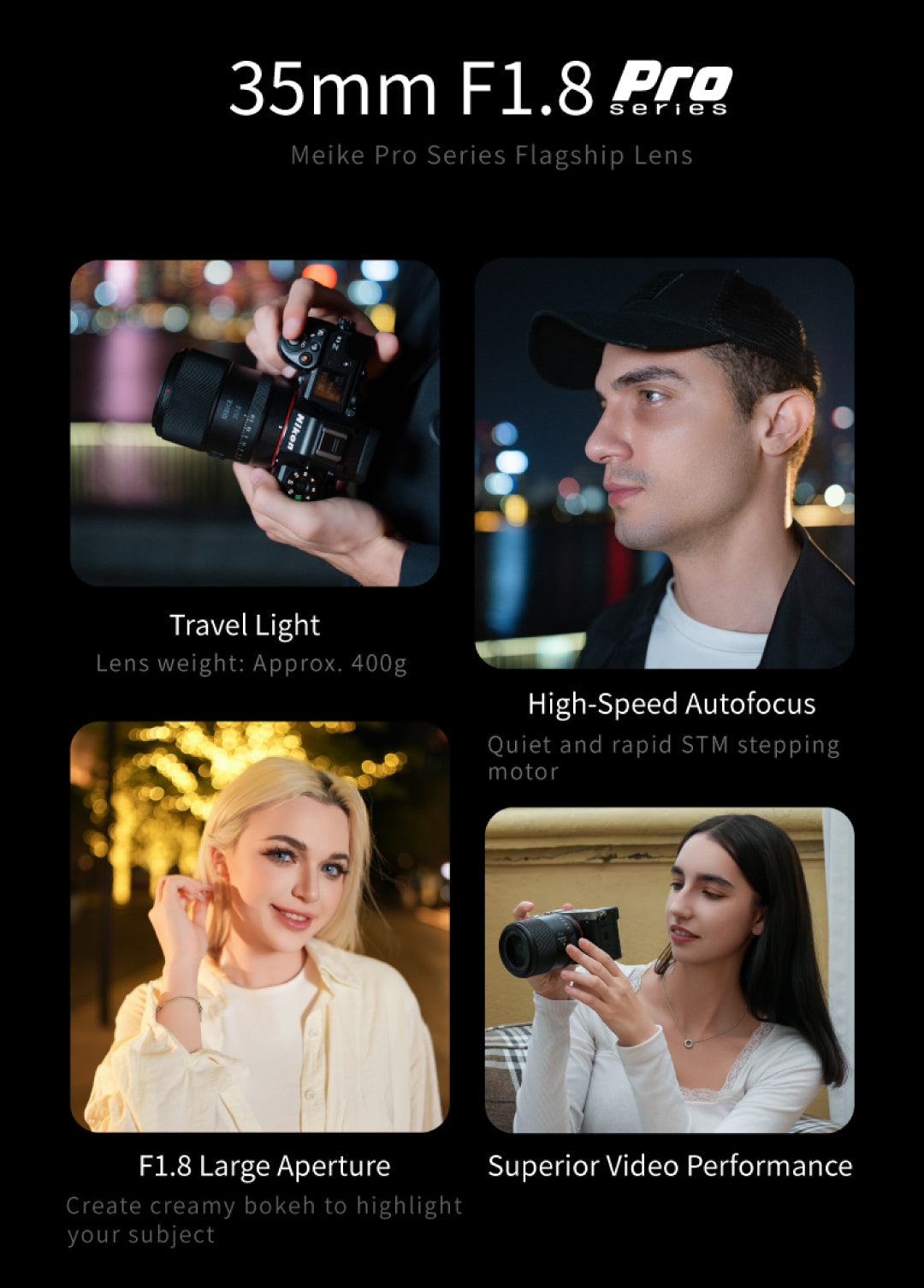 Meike 35mm f1.8 Pro Full Frame objektiv s samodejnim ostrenjem STM za fotoaparate Sony E Mount. Snemajte osupljive slike z objektivom Meike 35 mm f/1,8 STM s samodejnim ostrenjem, zasnovanim posebej za Sonyjeve fotoaparate polnega formata. Ta vsestranski osnovni objektiv ponuja svetlo zaslonko f/1,8, ki je kot nalašč za doseganje čudovite bokeh in odlične rezultate v pogojih šibke svetlobe.