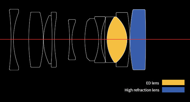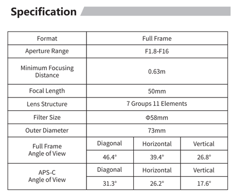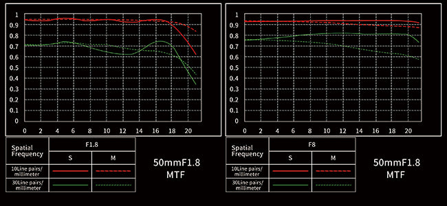 Popolnoma nov objektiv 50 mm/F1,8 uporablja najnovejšo optično strukturo, zaradi česar lahko doseže veliko zaslonko F1,8, hkrati pa ohranja miniaturizacijo in nizko težo. Na obeh straneh objektiva je uporabljena tehnologija večplastnega premaza, ki povrne bolj realistične barve. Na objektiv se ne more zlahka pritrditi prah ali madeži, zato ga je mogoče zlahka obrisati.