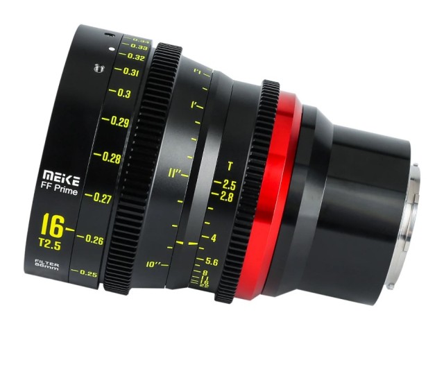 To je Meikejev šesti objektiv za kinematografijo FF, ki se zdaj pridružuje družini objektivov za kinematografijo FF. Pokriva 45 mm slikovni krog. Na voljo je z objektivi PL, Canon EF, Canon RF, Sony E in Panasonic L. Celoten komplet vključuje objektive 16 mmT2,5, 24 mm, 35 mm, 50 mm, 85 mm, 105 mmT2,1 in 135 mmT2,4. Objektiv je opremljen s standardnimi zobniki z razmikom 0,8 mm na obročih za ostrenje in zaslonko. konstrukcija objektiva Meike 16mm T2.5 FF-Prime je sestavljena iz šestnajstih elementov v enajstih skupinah. mehanizem zaslonke je sestavljen iz 11 lamel. Najmanjša razdalja ostrenja je 30 cm.