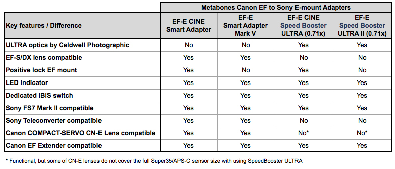 Novi pametni adapter EF-E Mount "CINE Speed Booster" omogoča uporabo Canonovih objektivov EF/EF-S/DX na Sonyjevih fotoaparatih z bajonetom E, kot so PXW-FS7M2, PXW-FS5, PXW-FS7, NEX-FS700, NEX-FS100 ali A7SII, A7RII, A7II, A7S, A7R in A7. Adapter ima zelo robustno zasnovo za zahtevno fotografiranje na terenu in je opremljen s ključavnico za največjo varnost pri pritrjevanju objektivov EF. Optični sistem Speed Booster poveča svetlobno jakost objektivov za 1 številko zaslonke, izboljša njihovo prenosno funkcijo in zmanjša goriščno razdaljo.