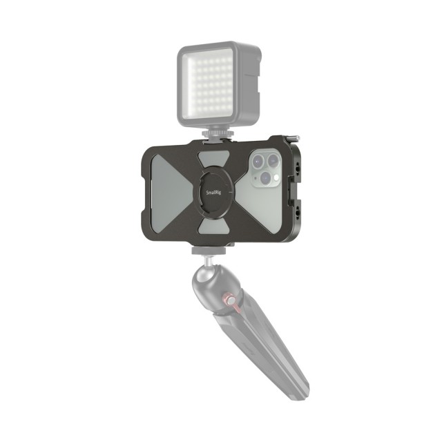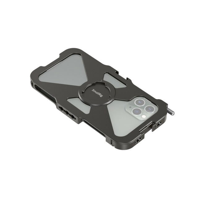 Mobilna kletka SmallRig Pro za iPhone 11 Pro CPA2471 je zasnovana tako, da ščiti vaš iPhone 11 Pro in omogoča priključitev dodatne dodatne opreme za mobilno fotografiranje in snemanje videoposnetkov, prenos v živo, intervjuje, vloganje itd. Na eni strani ima vijak, ki zagotavlja hitro namestitev in odstranitev telefona. Ima dva hladna čevlja in več lukenj z navojem 1/4"-20 za pritrditev različnih dodatkov, kot so mikrofon, luč LED, stativ itd., ter podpira tako vodoravno kot navpično snemanje. Združljiv je z aluminijastim stranskim ročajem HSS2424 za kletko za pametni telefon za snemanje iz roke in sponko za kabel mobilnega telefona BSC2390 za pritrditev kabla med snemanjem. Vgrajene gumijaste blazinice pomagajo absorbirati udarce in preprečujejo praske na telefonu. Zaradi votle zasnove za zmanjšanje teže in hlajenje mobilnega telefona se izogne stranskim gumbom in vmesnikom ter območju antene, da se izogne nevarnosti motenj signala.