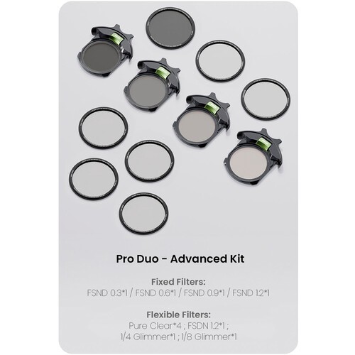 MOFAGE Pro Duo Advanced Kit je vrhunska kolekcija vstavljivih filtrov za POCO Adapter, ki združuje popoln nadzor svetlobe z ustvarjalnim razprševanjem. Vključuje štiri fiksne filtre FSND (0,3,0,6,0,9, 1,2) za zmanjšanje svetlobe za 1 do 4 stopnje, ter priljubljena filtra Glimmer Diffusion1/8 in 1/4 za čudovit kinematografski sijaj. Sistem je v celoti zložljiv, da se lahko kombinira moč ND z ustvarjalnimi učinki.