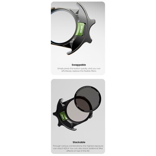Sistem za nalaganje: Zasnova Pro Duo z dvojnim režem omogoča takojšnjo kombinacijo FSND (fiksnih filtrov) z Glimmer ali Pure Clear (prilagodljivimi filtri). To omogoča hkratno filtriranje ND in difuzijo ali nalaganje ND za doseganje visokih gostot, kot je ND2.4 (8 stopenj), z dodatnimi filtri.