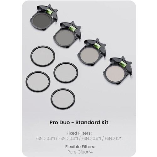 MOFAGE Pro Duo Standard Kit je osnovni komplet za sistem POCO Adapter drop-in, ki omogoča profesionalno nadzorovanje nevtralne gostote (FSND). Vključuje štiri fiksne ND-filtre (0,3,0,6,0,9, 1,2) za zmanjšanje svetlobe za 1 do 4 stopnje in štiri prozorne fleksibilne filtre za ohranjanje ostrenja brez učinka. Celoten komplet je mogoče kombinirati za skupno moč ND do ND2,4 (8 stopenj).